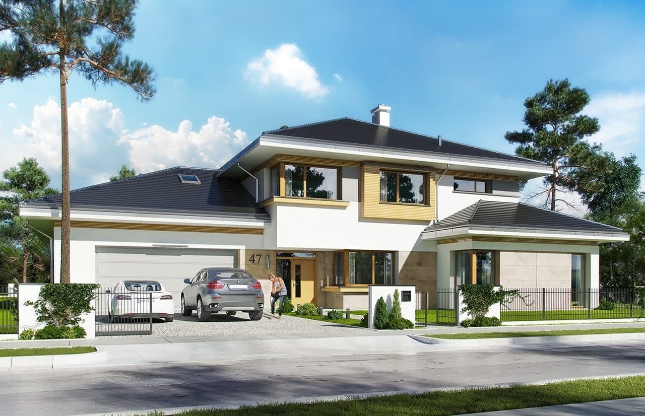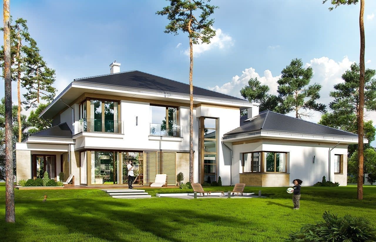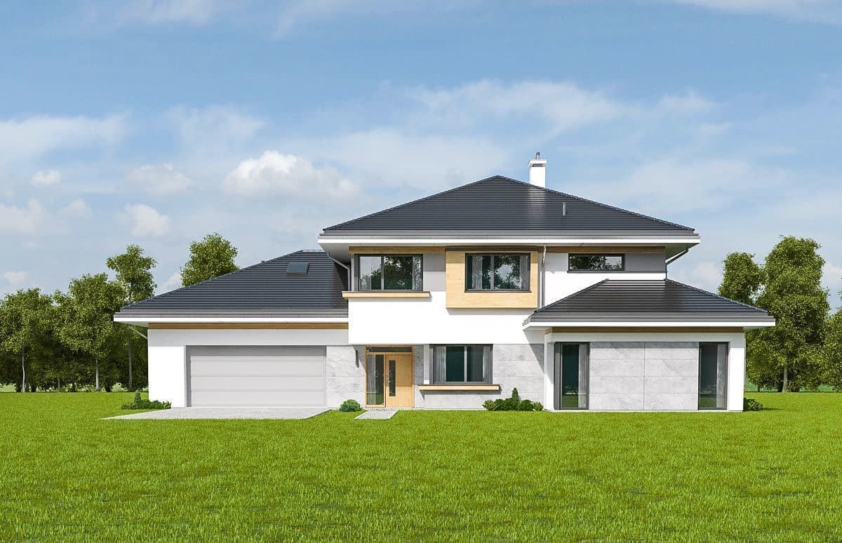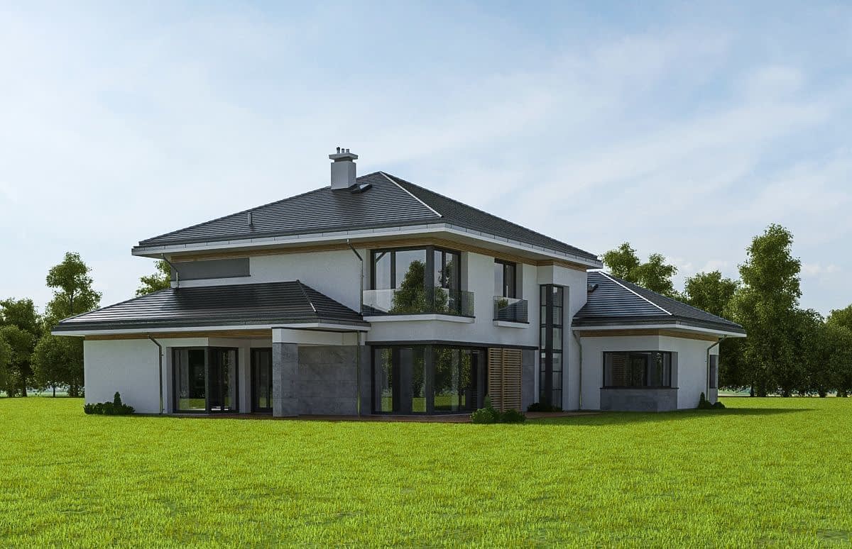 Projekt domu Spokojny zakątek to projekt piętrowej luksusowej willi miejskiej, przeznaczonej dla 4-6 osobowej rodziny. Jest to projekt bardzo komfortowego, nowoczesnej rezydencji, dla wymagających inwestorów, ceniących dobrą architekturę i luksus w funkcjonalnym przestronnym wnętrzu. Projekt domu Spokojny zakątek składa się z zasadniczej prostopadłościennej bryły na planie kwadratu, przykrytej kopertowym dachem, oraz dodatkowych dwóch niższych brył - garażowej i drugiej przekrywającej pokój rekreacyjny i zadaszony taras. Z zewnątrz dom prezentuje się dostojnie - reprezentacyjnie i trochę surowo od frontu, aby od strony ogrodowej emanować spokojem. Duże przeszklone powierzchnie okien zdobią elewacje i otwierają wnętrze na ogród. Na parterze zaprojektowaliśmy piękną przestrzeń dzienną, z salonem, wielką kuchnią z wyspą, bardzo efektownymi schodami naprzeciwko wejścia, jadalnią i dodatkowym pokojem rekreacyjnym - takim drugim zamkniętym salonem, gdzie można zainstalować sobie na przykład dobre kino domowe, albo urządzić pokój fitness. Na parterze mamy też wielki garaż, dodatkowy pokój z łazienką, oraz duże pomieszczenie gospodarcze. Narożne przeszklenia z salonu, czy piękny zadaszony taras- weranda z jadalni otwierają dom na ogród. Na piętrze mamy aż cztery wygodne sypialnie z garderobami i dwiema łazienkami (właściwie salonami kąpielowymi). Sypialnie rodziców to osobny apartament z własną łazienką i garderobą. Na piętrze mamy dodatkowo pralnię – suszarnię, oraz strych dostępny z części garażowo-gospodarczej domu. Dom, choć duży, mieści w sobie bardzo racjonalnie zakomponowaną przestrzeń. Nie ma tutaj żadnego marnotrawstwa, a jednocześnie uzyskano efekt luksusu dużej przestrzeni. Dom jest energooszczędny. Mimo swojej wielkości, projekt domu Spokojny zakątek nie powinien być bardzo drogi w budowie, ani bardzo kosztowny w późniejszym utrzymaniu.
