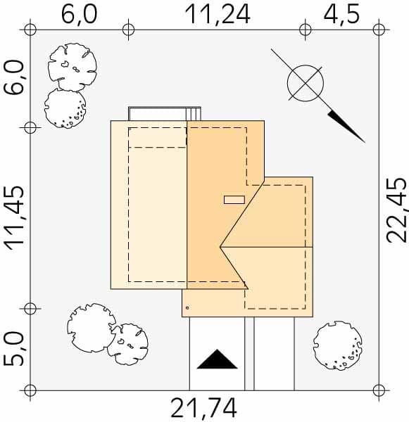 - Minimalne wymiary działki22.45 x 21.74m