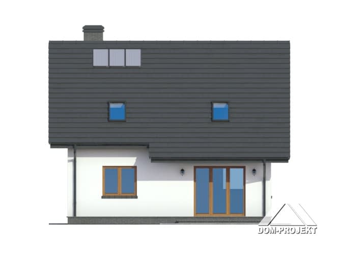 Dom w konstrukcji szkieletu drewnianego. Duży salon z aneksem kuchennym i wyjściem na taras. Pokój, łazienka, spiżarka, kotłownia i wiatrołap. Na poddaszu trzy pokoje, łazienka i komunikacja. Zwarte bryła budynku i dach dwuspadowy sprzyjają szybkiej i taniej budowie oraz niskim kosztom eksploatacji.Rzuty