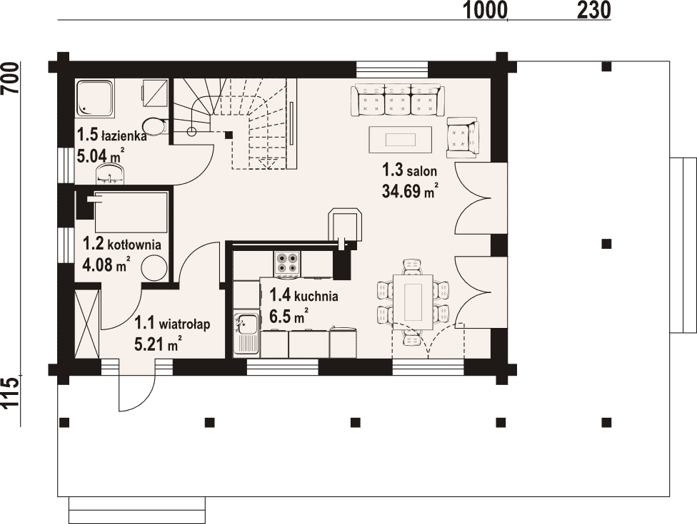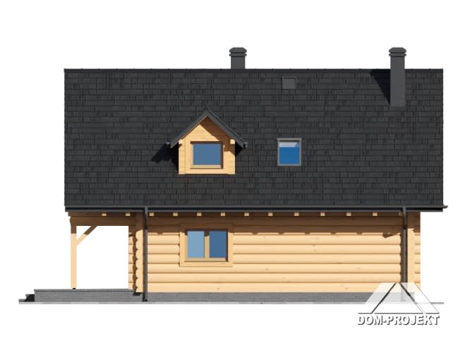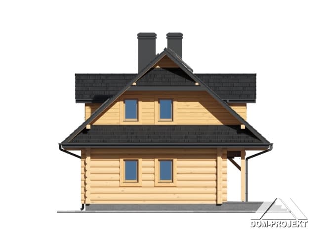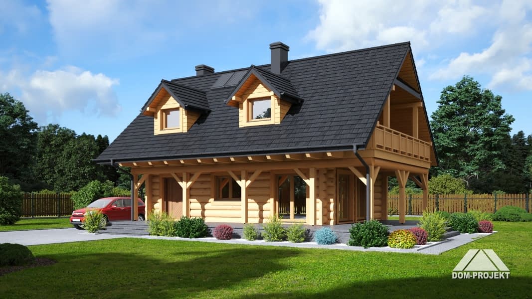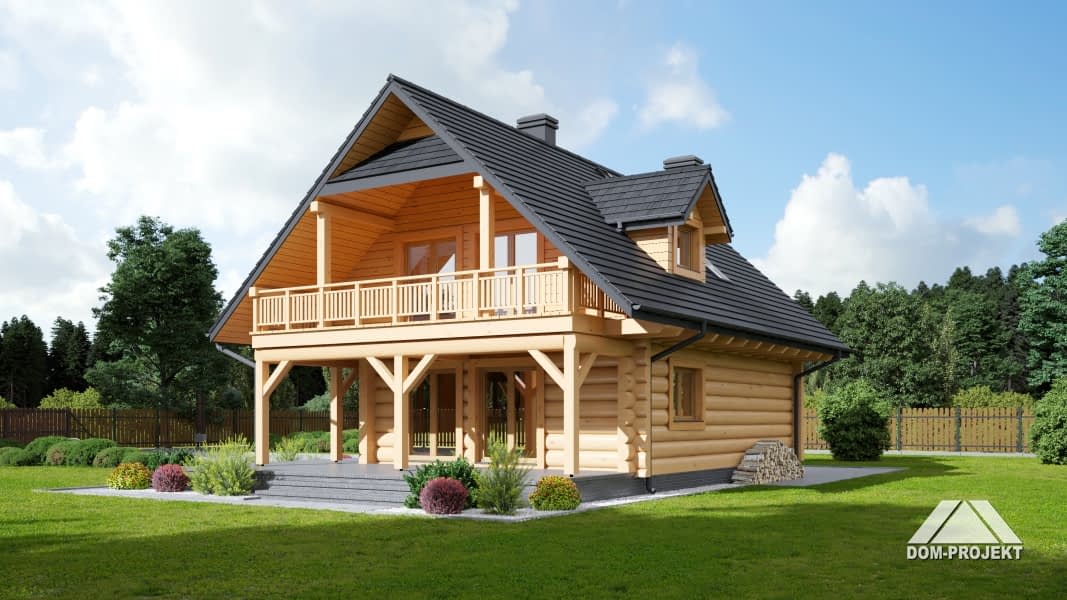 Dom z bali. Duży salon z aneksem kuchennym, kominkiem, wyjściami na zadaszony taras i schodami na poddasze. Łazienka, wiatrołap i kotłownia. Na poddaszu trzy pokoje, łazienka, komunikacja i balkon. Instalacja solarna. Zwarta bryła budynku i dach dwuspadowy sprzyjają szybkiej i taniej budowie i niskim kosztom eksploatacji.Rzuty