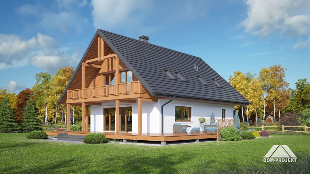 Dom w konstrukcji szkieletu drewnianego. Duży salon z aneksem kuchennym, jadalnią, wypoczynkiem, kominkiem, wyjściem na zadaszony taras i schodami na poddasze. Pokój, łazienka, kotłownia, wiatrołap. Na poddaszu trzy pokoje, łazienka, garderoba, komunikacja i dwa balkony. Zwarta bryła budynku i dach dwuspadowy sprzyjają szybkiej i taniej budowie i niskim kosztom eksploatacji.Rzuty