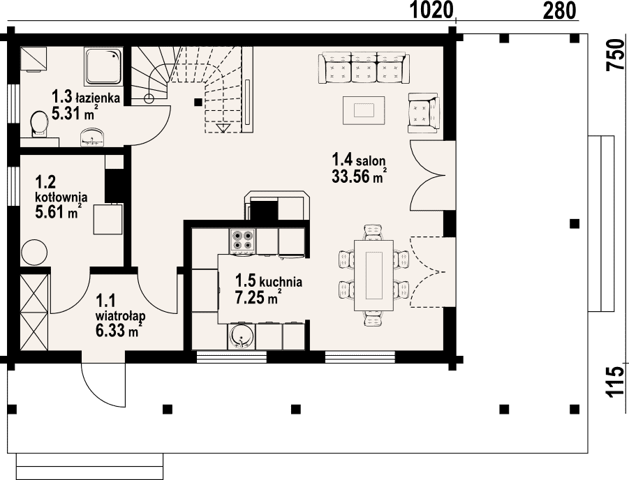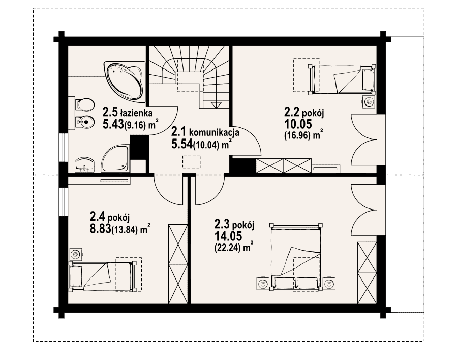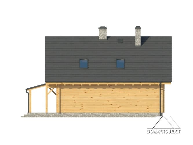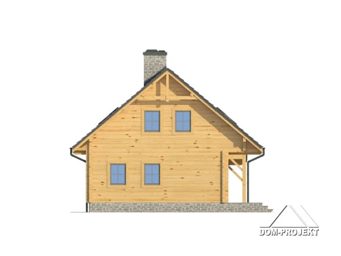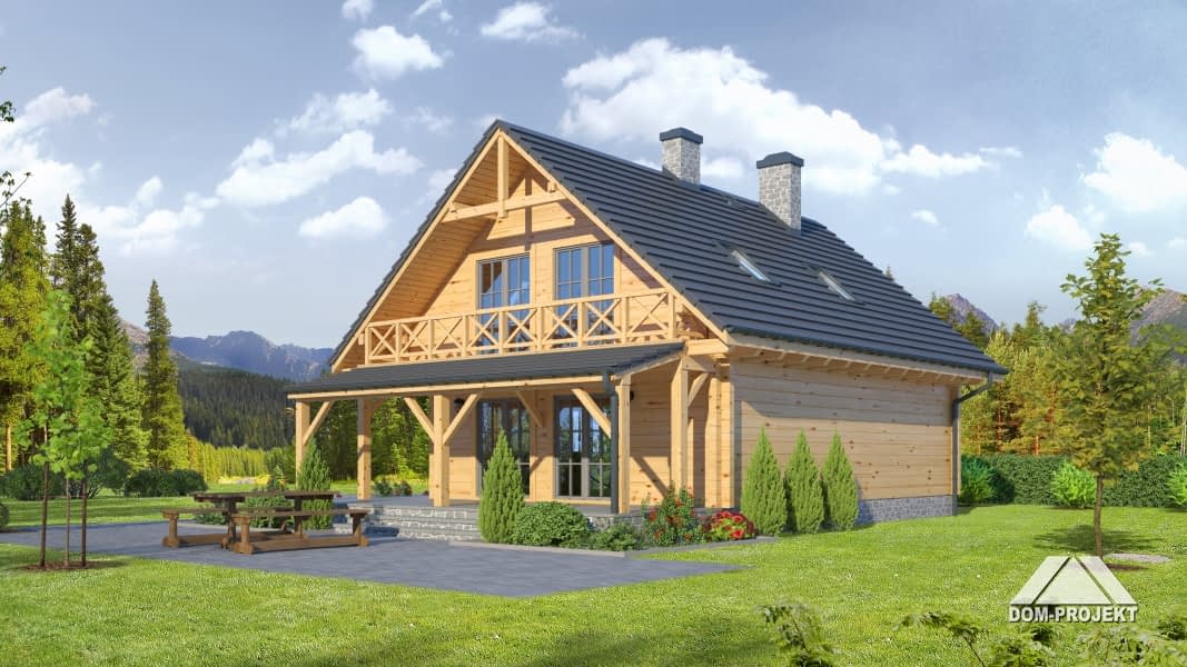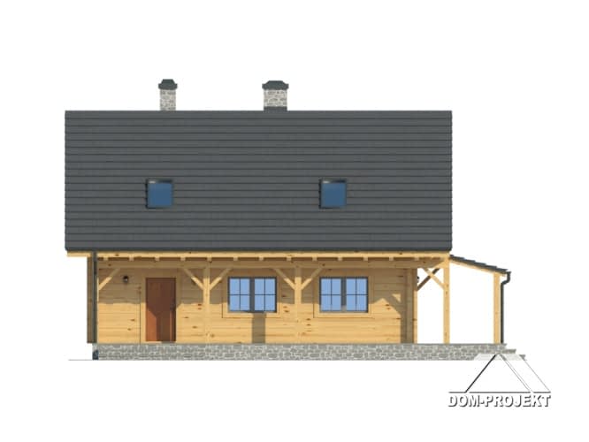 Dom z bali drewnianych. Duży salon z przejściem do kuchni, kominkiem, wyjściami na taras i schodami na poddasze. Łazienka, wiatrołap i kotłownia. Duży zadaszony taras. Na poddaszu trzy pokoje (dwa z balkonem), łazienka i komunikacja.Rzuty