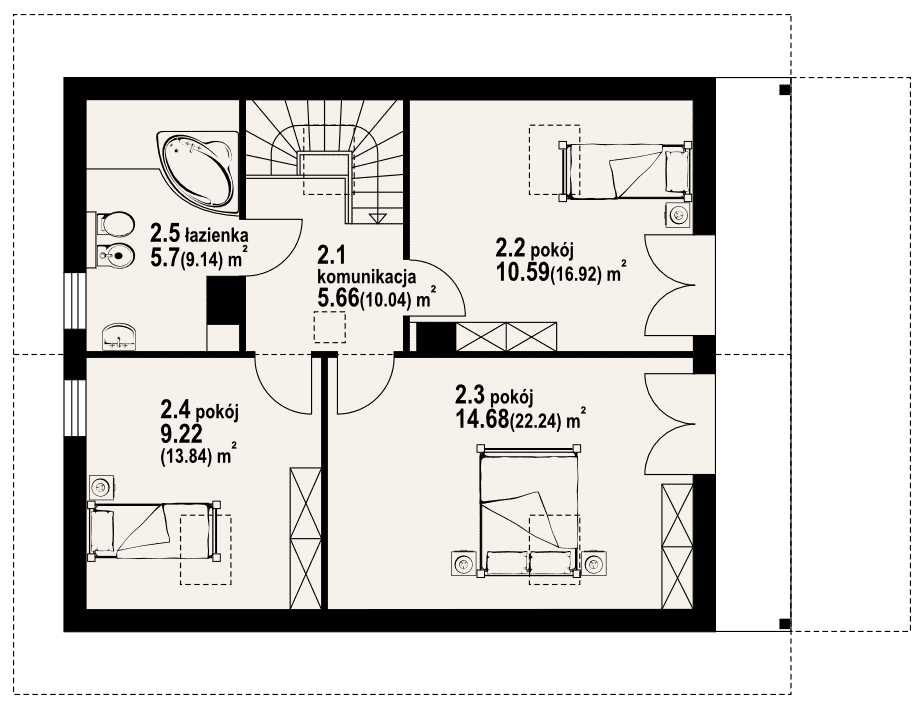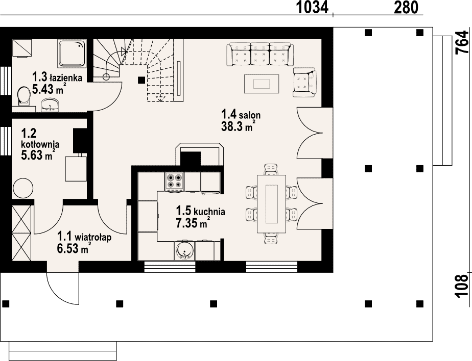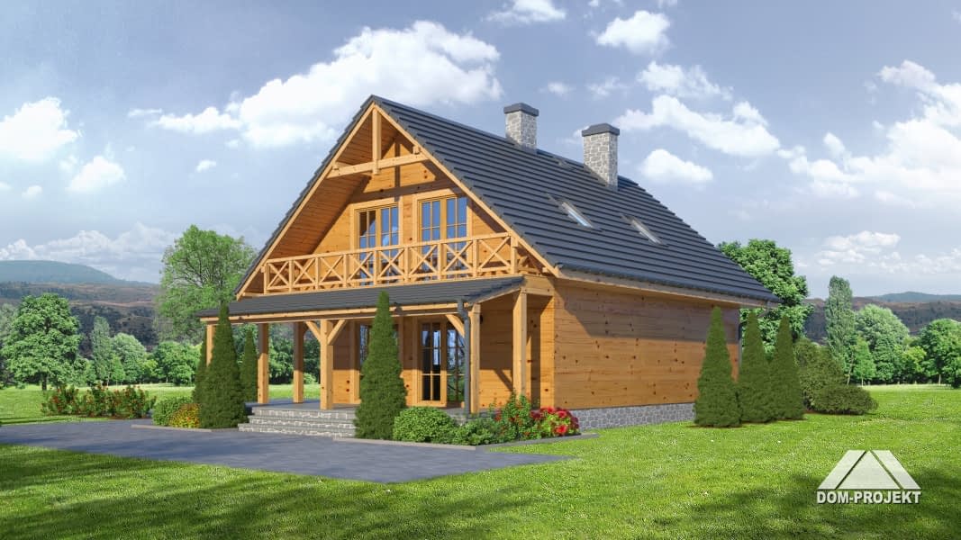 Dom mieszkalny w konstrukcji szkieletu drewnianego. Duży salon z kominkiem, schodami i wyjściem na taras, wygodna kuchnia, łazienka, wiatrołap i kotłownia. Duży taras zadaszony. Na poddaszu trzy wygodne pokoje, wygodna łazienka, komunikacja i balkon. Zwarta bryła budynku i dach dwuspadowy sprzyja szybkiej i taniej budowie oraz niskim kosztom eksploatacji.Rzuty