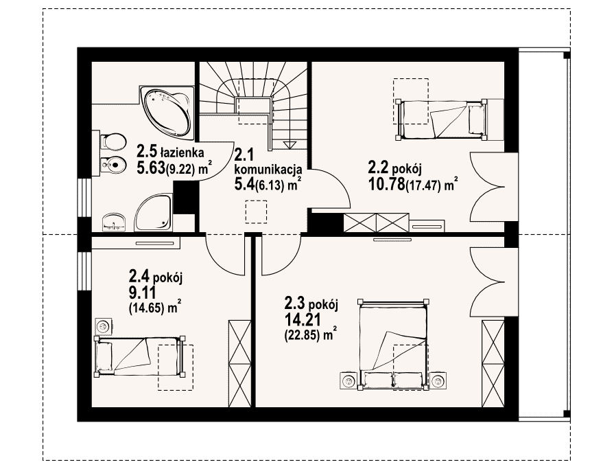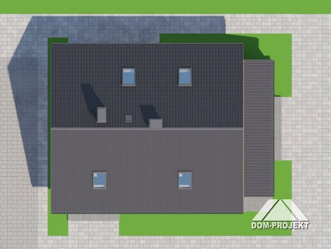 Dom z poddaszem. Parter murowany (beton komórkowy+ocieplenie), poddasze - szkielet drewniany. Duży salon z aneksem kuchennym, kominkiem, schodami na poddasze i wyjściem na zadaszony taras. Łazienka, kotłownia, wiatrołap. Na poddaszu trzy pokoje, łazienka, komunikacja i balkon.Rzuty