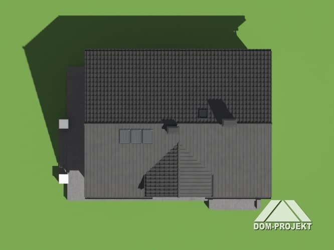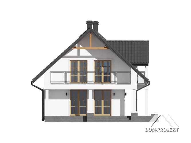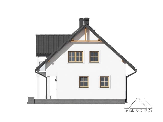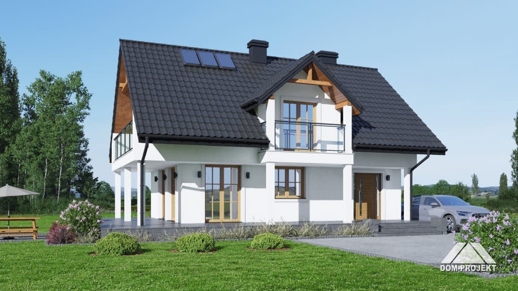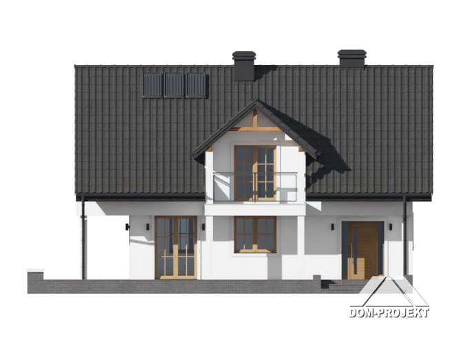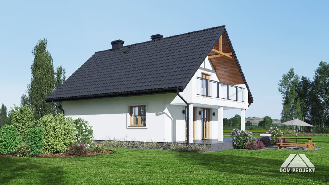 Dom z poddaszem użytkowym. Na parterze salon z kuchnią, kominkiem oraz wyjściem na częściowo zadaszony taras. Łazienka, kotłownia, komunikacja, wiatrołap. Na poddaszu trzy pokoje, łazienka, komunikacja i dwa balkony. Zwarta bryła budynku i dach dwuspadowy sprzyjają szybkiej i taniej budowie oraz niskim kosztom eksploatacji.Rzuty