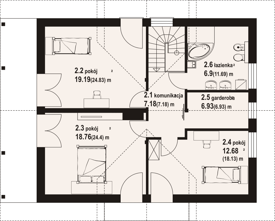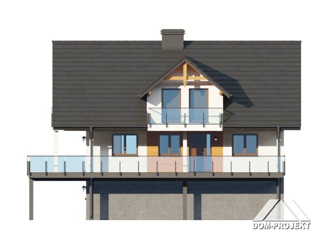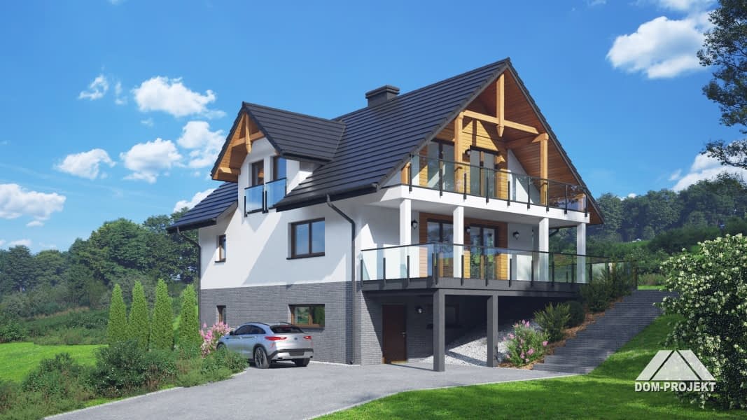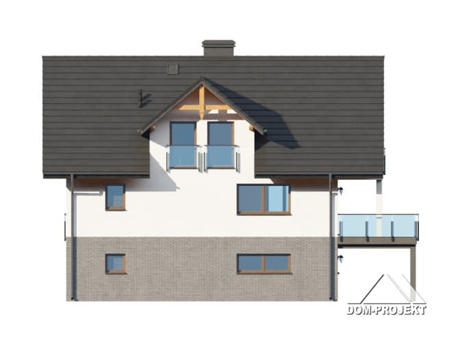 Dom z poddaszem użytkowym. Podpiwniczony. Na parterze salon z kominkiem, schodami na poddasze oraz wyjściem na taras. Częściowo wydzielona kuchnia z jadalnią, pokój, łazienka, garderoba, wiatrołap, komunikacja. Na poddaszu trzy pokoje, łazienka, garderoba, komunikacja. Dwa balkony. W podpiwniczeniu dwa pomieszczenia gospodarcze oraz kotłownia.Rzuty