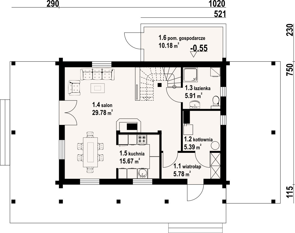 Dom z bali drewnianych. Duży salon z aneksem kuchennym, kominkiem, wyjściem na zadaszony taras i schodami na poddasze.Łazienka, kotłownia i wiatrołap. Na poddaszu trzy pokoje, łazienka i komunikacja. Zwarta bryła budynku i dach dwuspadowy sprzyjają szybkiej i taniej budowie i niskim kosztom eksploatacji.Rzuty