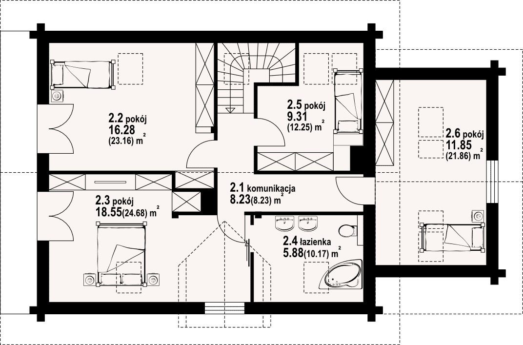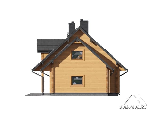 Dom z bali drewnianych. Na parterze salon z kominkiem, schodami na poddasze oraz wyjściem na taras. Kuchnia, jadalnia, łazienka, garaż, kotłownia. Na poddaszu cztery pokoje, łazienka i komunikacja. Dwa duże pokoje poddasza mają dostęp do balkonu.Zwarta bryła budynku i dach dwuspadowy sprzyjają szybkiej i taniej budowie i niskim kosztom eksploatacji.Rzuty
