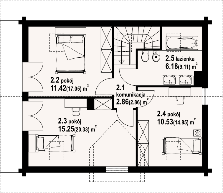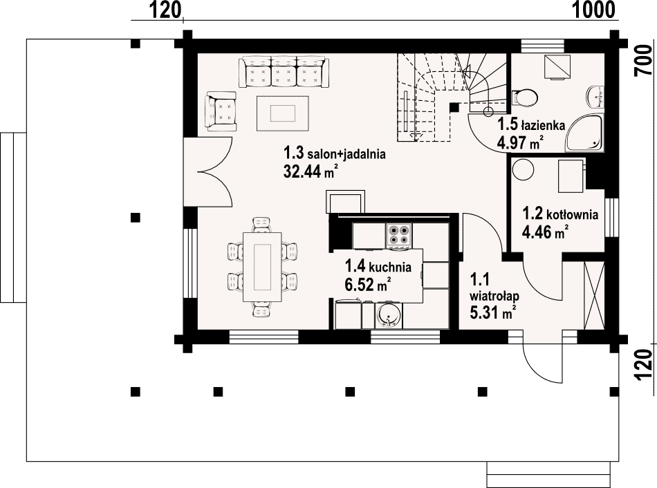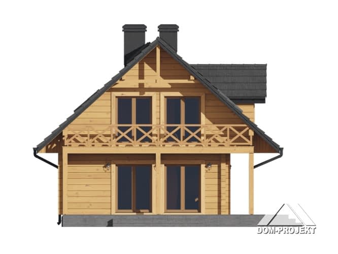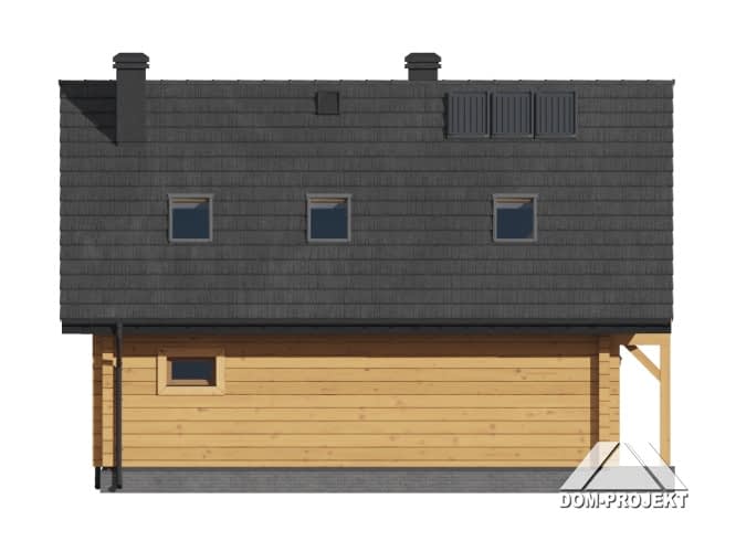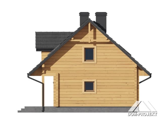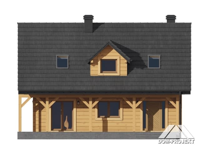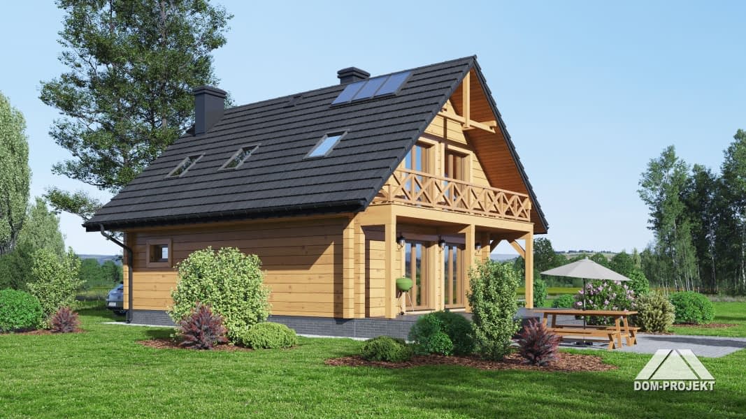 Dom z bali drewnianych. Zewnętrzny wygląd tradycyjny, układ funkcjonalny wewnątrz współczesny. 4 pokoje, 2 łazienki, aneks kuchenny, kotłownia, wiatrołap. Duży salon z aneksem kuchennym, schodami na poddasze, kominkiem i wyjściem na taras. Liczne wersje projektu.Rzuty