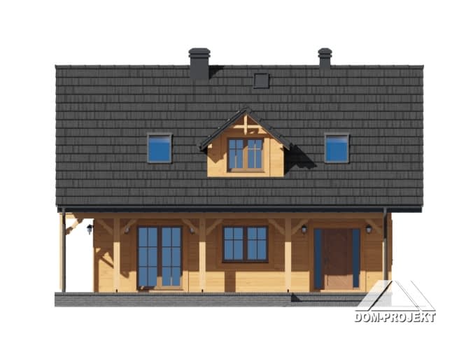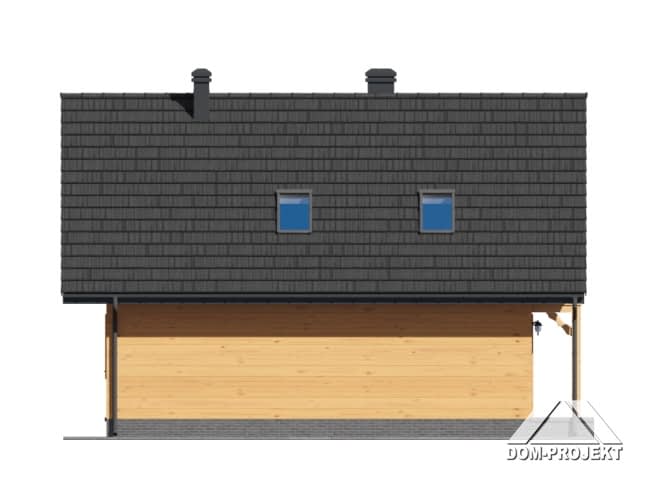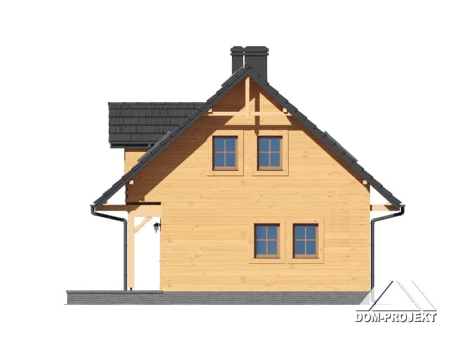 Niewielki dom z poddaszem użytkowym. Parter to część dzienna: salon z aneksem kuchennym i wyjściem na duży, częściowo zadaszony taras zewnętrzny. Kominek w salonie. Wydzielona kotłownia. Na poddaszu trzy pokoje - sypialnie i łazienka.Rzuty