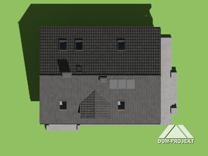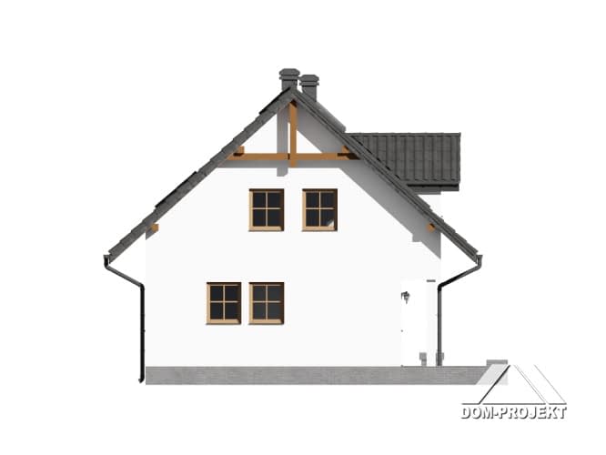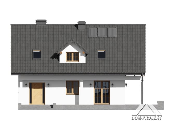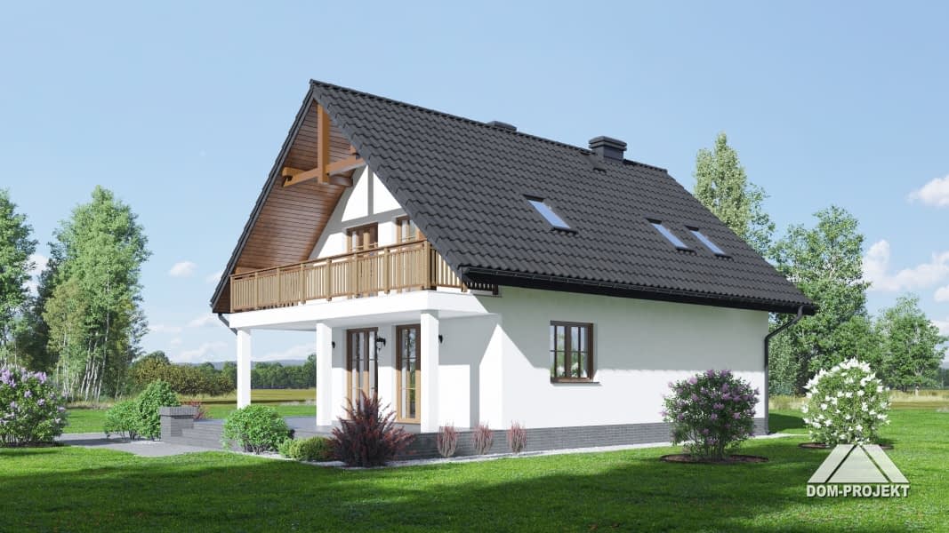 Nieduży ale wygodny dom. 4 pokoje, 2 łazienki, aneks kuchenny, kotłownia, wiatrołap. Duży salon z aneksem kuchennym, kominkiem, schodami na poddasze i wyjściem na taras. 3 wygodne sypialnie na poddaszu. Dom tani w budowie i eksploatacji. Liczne wersje projektu.Rzuty