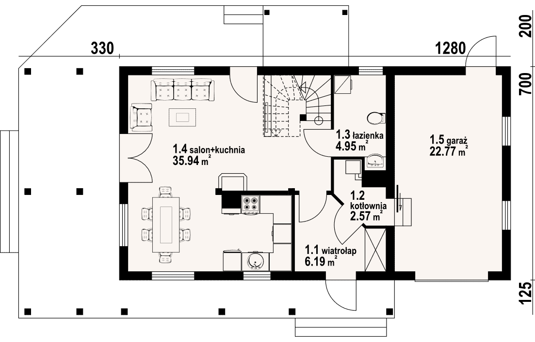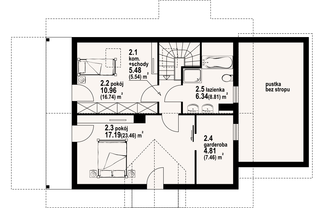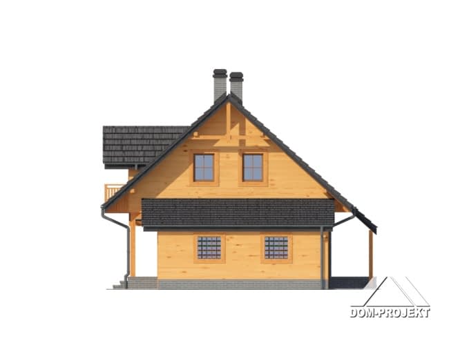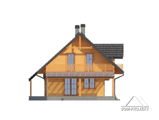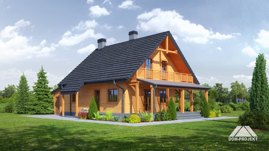 Dom w konstrukcji szkieletu drewnianego. Otwarta przestrzeń parteru. Duży salon z aneksami jadalnym oraz kuchennym, kominkiem, wyjściem na zadaszony taras i schodami na poddasze. Łazienka, kotłownia, wiatrołap i garaż. Na poddaszu dwa wygodne pokoje (sypialnia małżeńska z garderobą), duża łazienka, komunikacja, dwa balkony. Zwarta bryła budynku i dach dwuspadowy sprzyjają taniej i szybkiej budowie i niskim kosztom eksploatacji.Rzuty