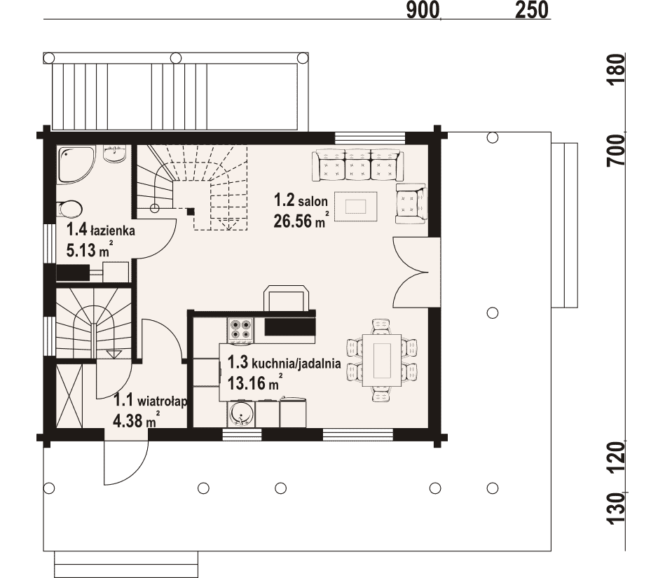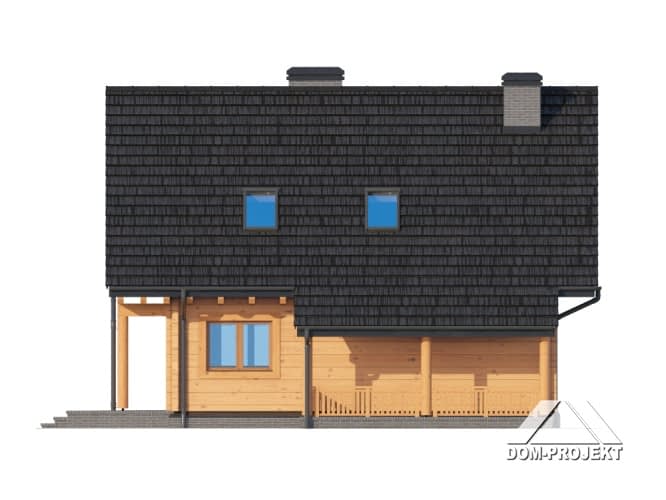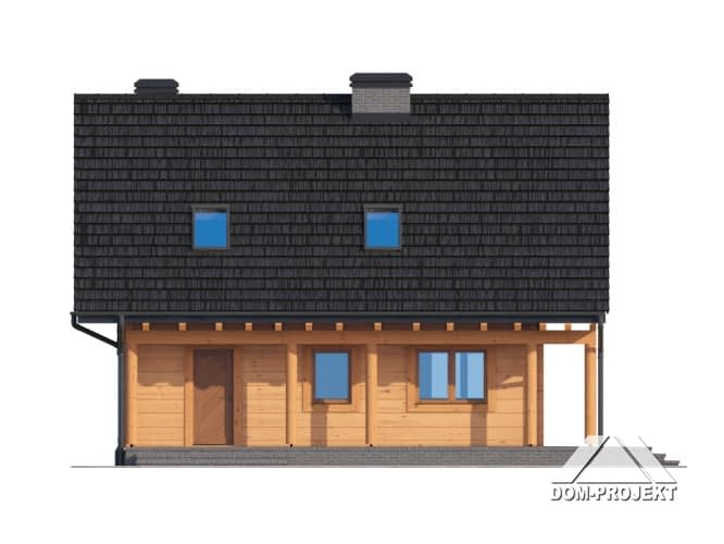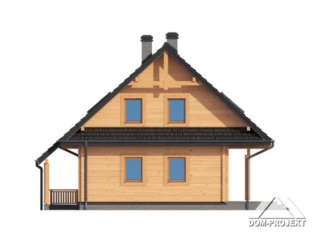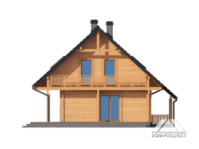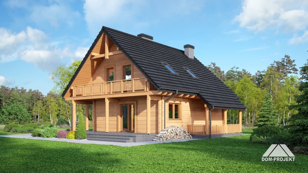 Dom z bali drewnianych. Podpiwniczony. Duży salon z aneksem kuchennym, kominkiem, wyjściem na zadaszony taras i schodami na poddasze. Łazienka, wiatrołap i schody do piwnicy. Na poddaszu trzy pokoje, łazienka, komunikacja i balkon. W piwnicach kotłownia, pralnia, piwnica i komunikacja. Zwarta bryła budynku i dach dwuspadowy sprzyjają szybkiej i taniej budowie i niskim kosztom eksploatacji.Rzuty