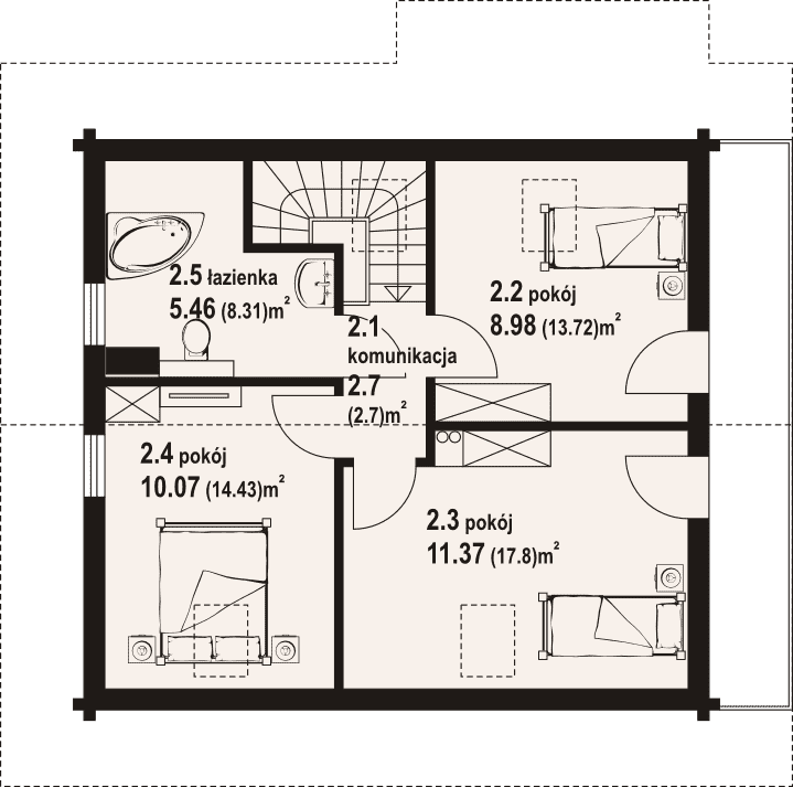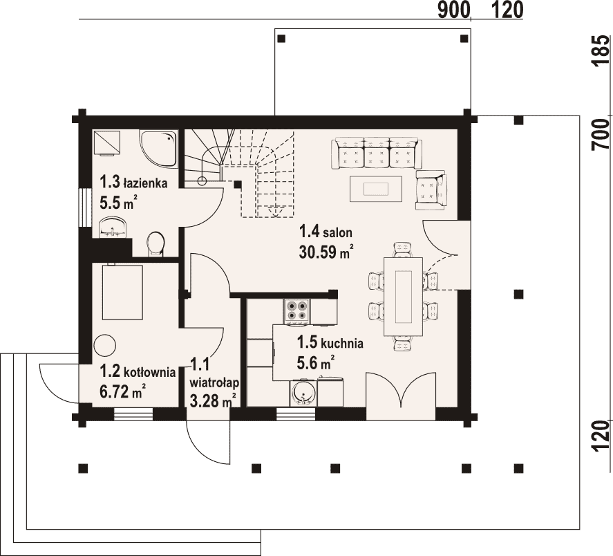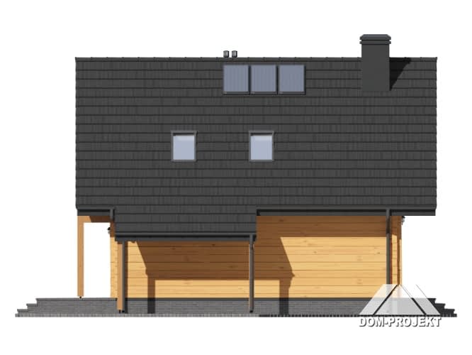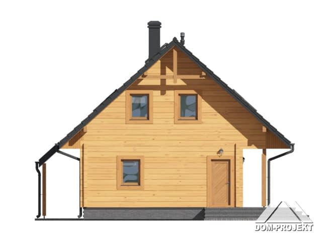 Nieduży dom z bali drewnianych. Duży salon z aneksem kuchennym, wyjściami na zadaszony taras i schodami na poddasze. Łazienka, kotłownia i wiatrołap. Na poddaszu trzy pokoje, komunikacja, łazienka i balkon. Zwarta bryła budynku i dach dwuspadowy sprzyjają szybkiej i tanie budowie i niskim kosztom eksploatacji.Rzuty
