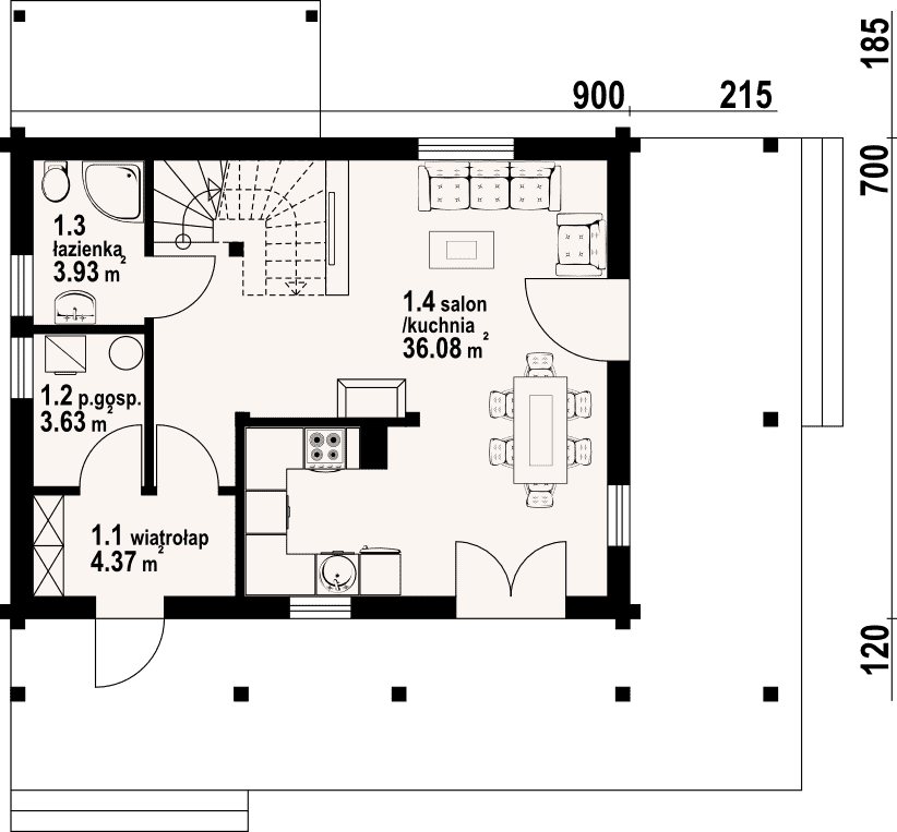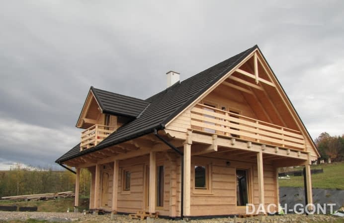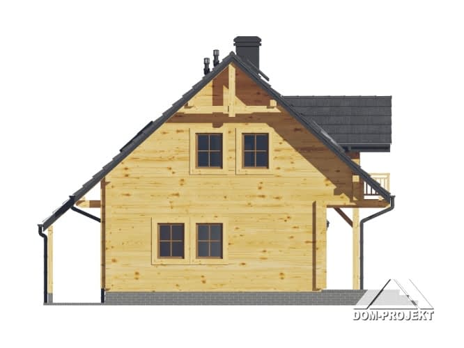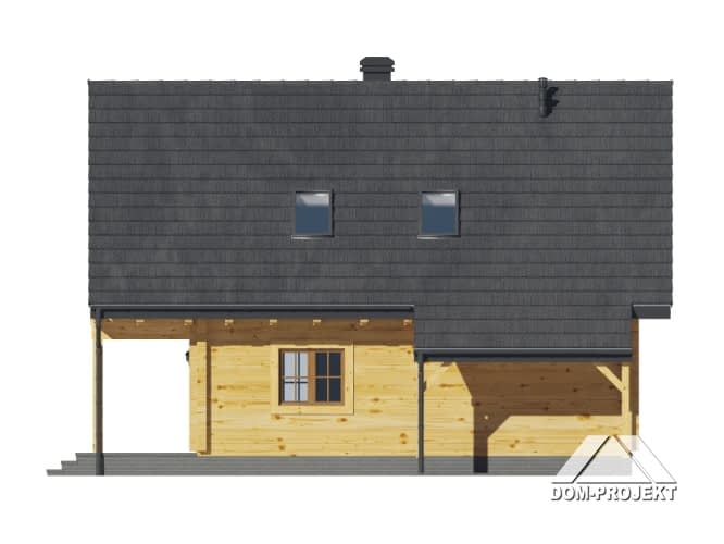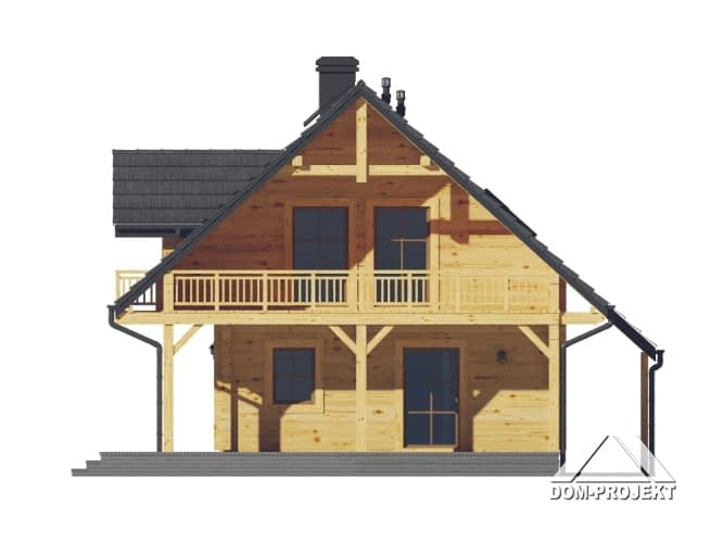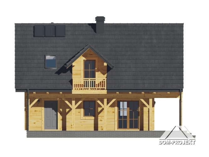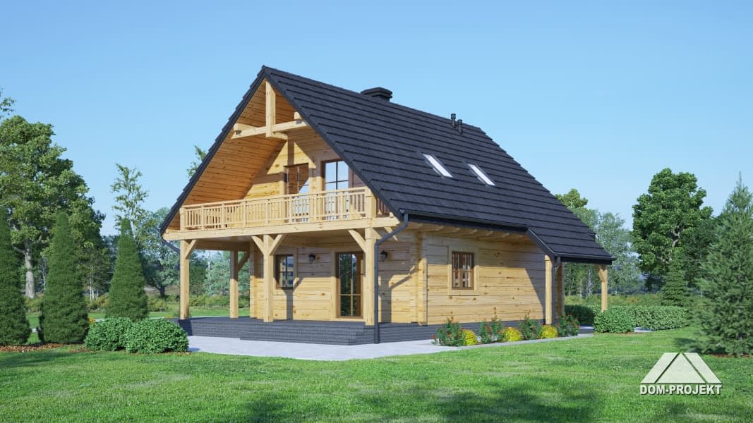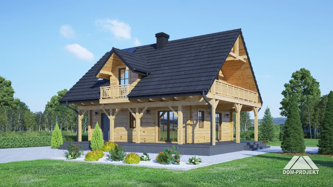 Dom z bali drewnianych. Duży salon z aneksem kuchennym, kominkiem, wyjściami na taras i schodami na poddasze. Łazienka, wiatrołap i pomieszczenie gospodarcze. Duży zadaszony taras. Na poddaszu trzy pokoje z balkonem, łazienka i komunikacja. prosta bryła budynku i dach dwuspadowy sprzyjają szybkiej i taniej budowie i niskim kosztom eksploatacji.Rzuty