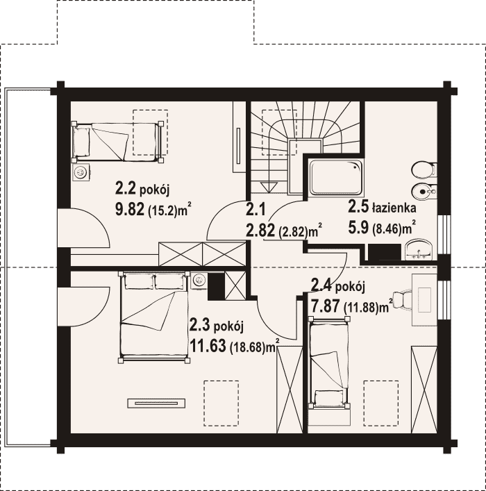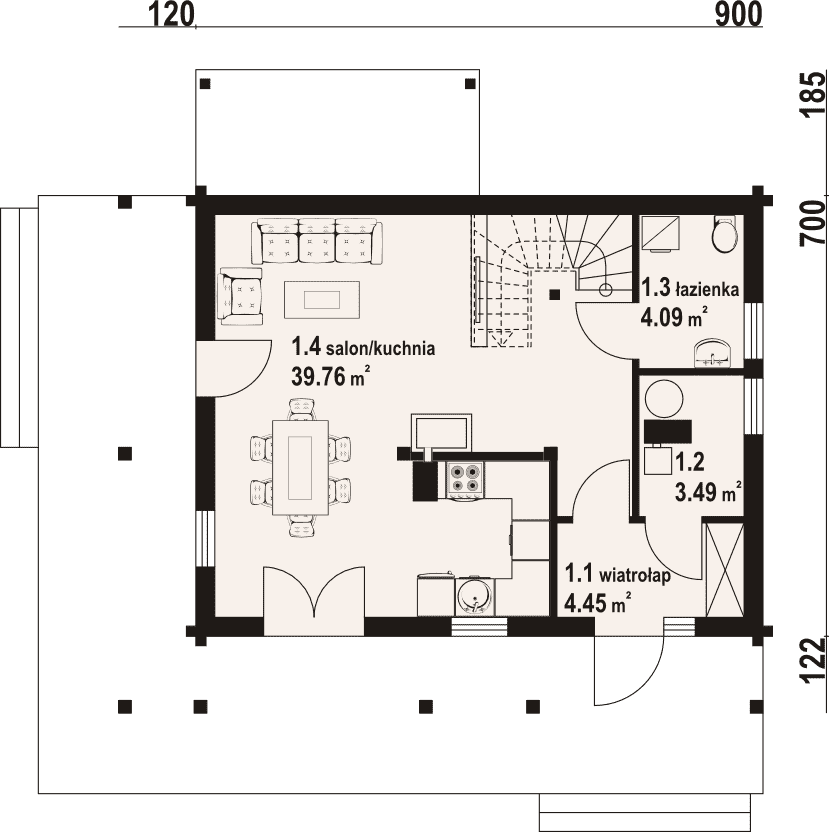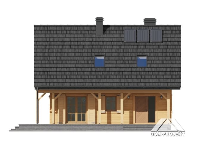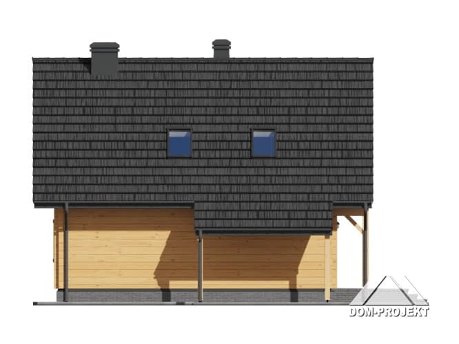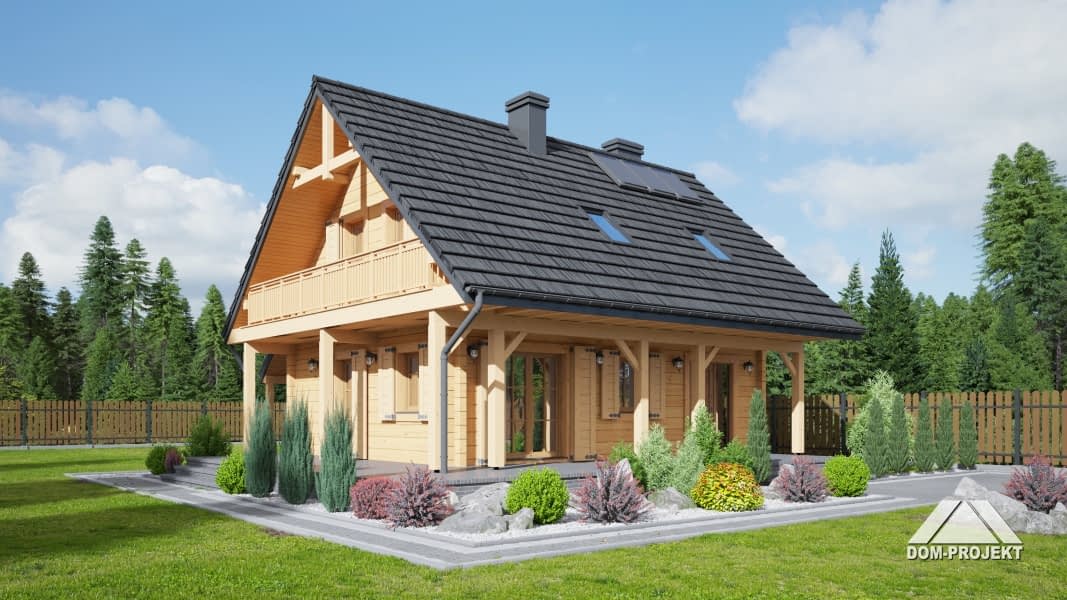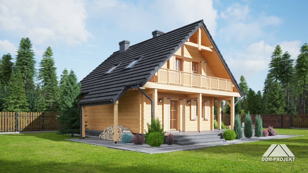 Dom z bali. Duży salon z aneksem kuchennym, kominkiem, wyjściami na duży zadaszony taras i schodami na poddasze. Łazienka, wiatrołap, kotłownia. Na poddaszu trzy pokoje, łazienka, komunikacja i balkon. Instalacja solarna. Zwarta bryła budynku i dach dwuspadowy sprzyjają szybkiej i taniej budowie i niskim kosztom eksploatacji.Rzuty