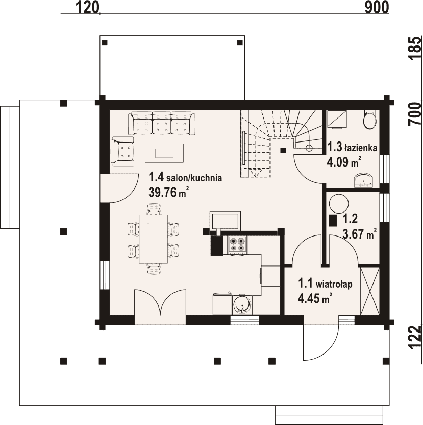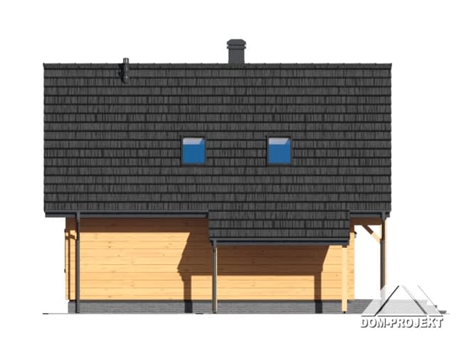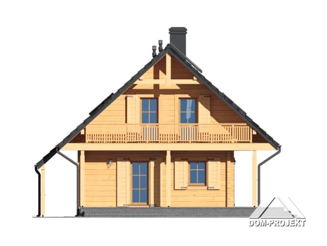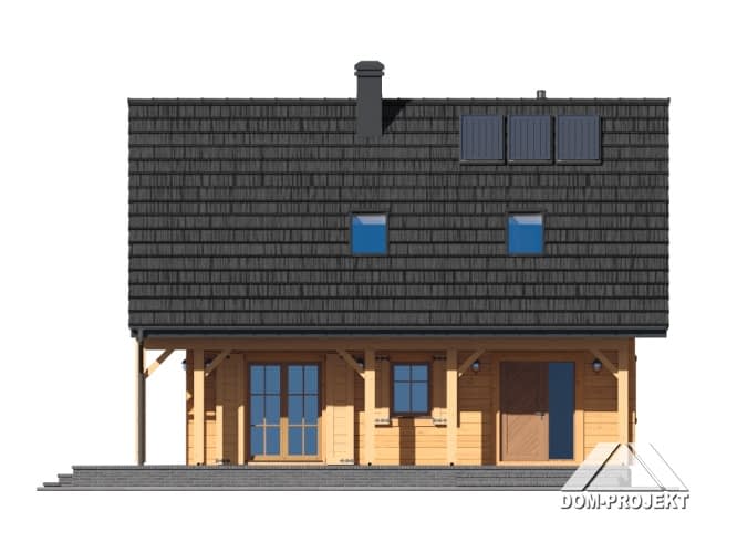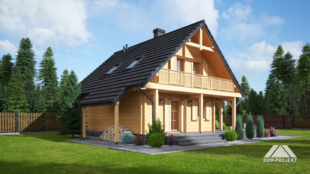 Dom z bali. Duży salon z aneksem kuchennym, kominkiem, wyjściami na duży zadaszony taras i schodami na poddasze. Łazienka, wiatrołap, pomieszczenie gospodarcze.Na poddaszu trzy pokoje, łazienka, komunikacja i balkon. Instalacja solarna. Zwarta bryła budynku i dach dwuspadowy sprzyjają szybkiej i taniej budowie i niskim kosztom eksploatacji.Rzuty