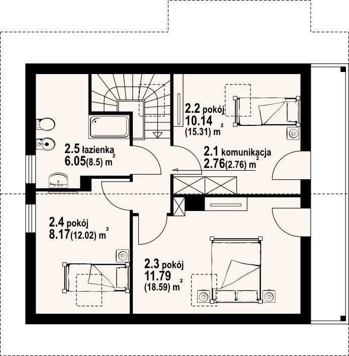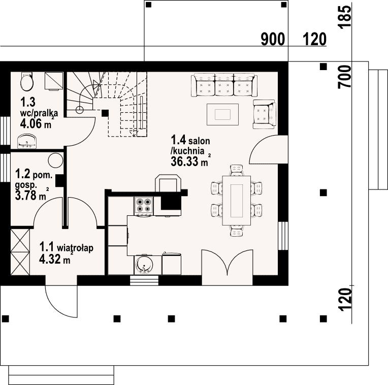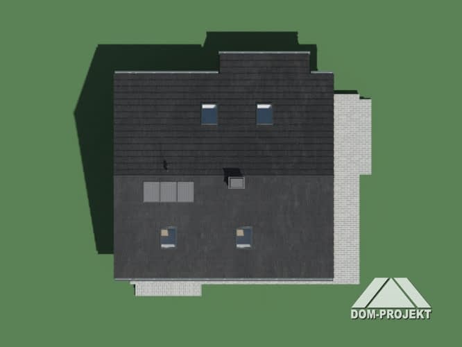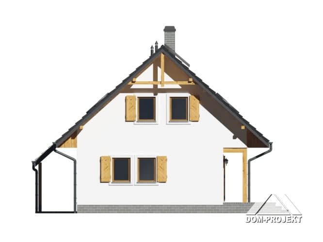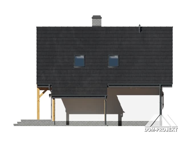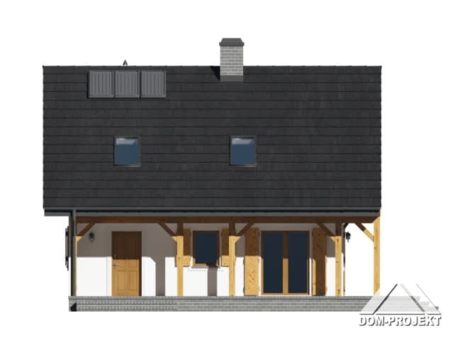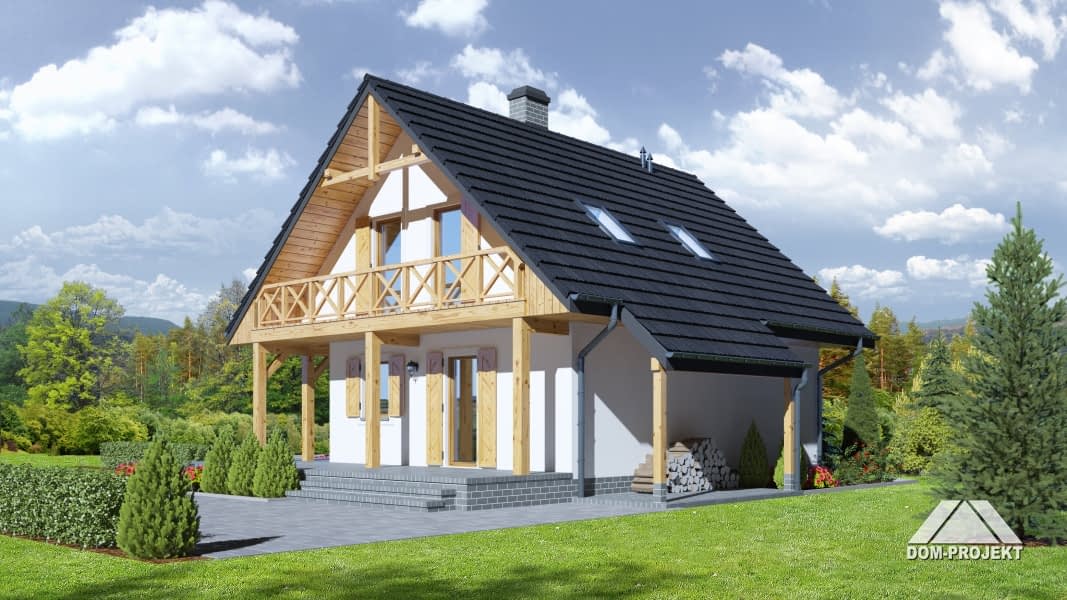Dom w konstrukcji szkieletu drewnianego. Duży salon z aneksem kuchennym, kominkiem, wyjściami na taras i schodami na poddasze. Łazienka, pomieszczenie gospodarcze, wiatrołap. Na poddaszu trzy pokoje, komunikacja i balkon. Prosta bryła budynku i dach dwuspadowy sprzyjają szybkiej i taniej budowie i niskim kosztom eksploatacji.Rzuty