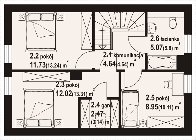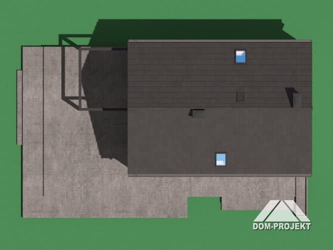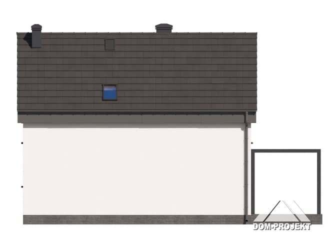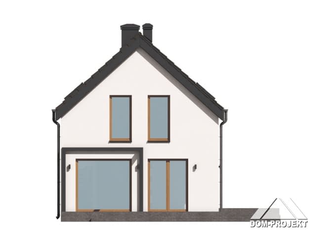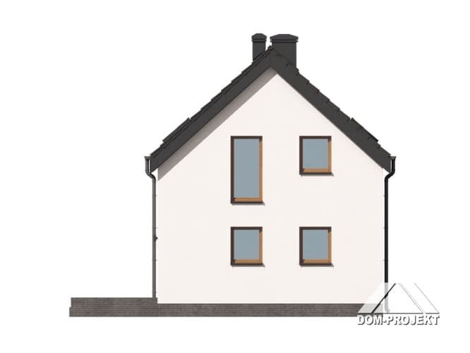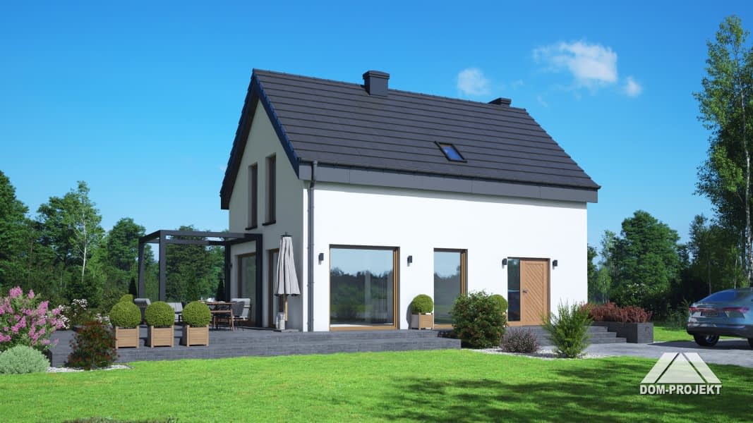 Dom z poddaszem użytkowym. Na parterze salon z kuchnią, kominkiem, wyjściem na taras i schodami na poddasze. Łazienka, kotłownia, wiatrołap. Na poddaszu trzy pokoje, garderoba, łazienka, komunikacja. Zwarta bryła budynku oraz dach dwuspadowy sprzyjają szybkiej i taniej budowie oraz niskim kosztom eksploatacji.Rzuty