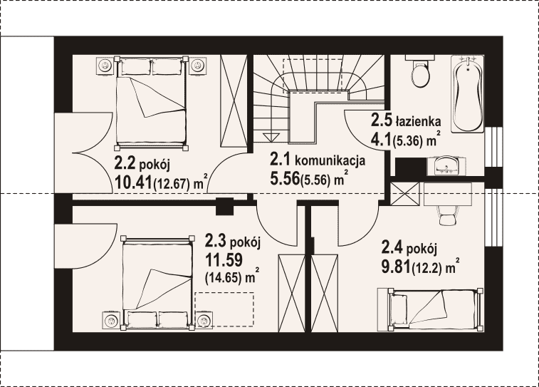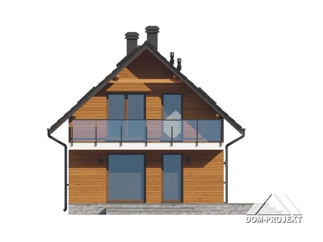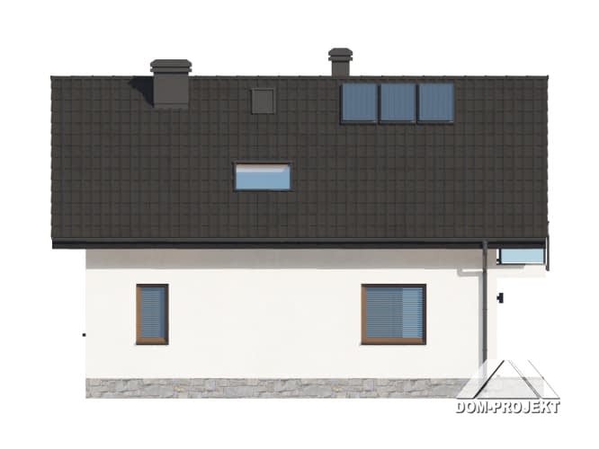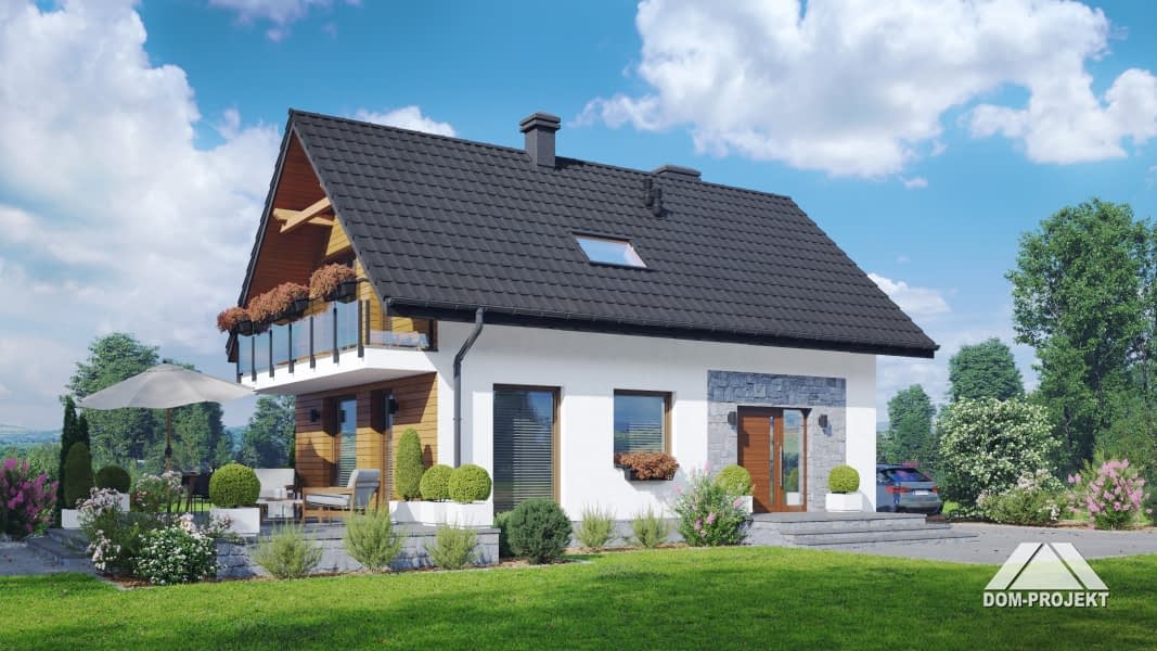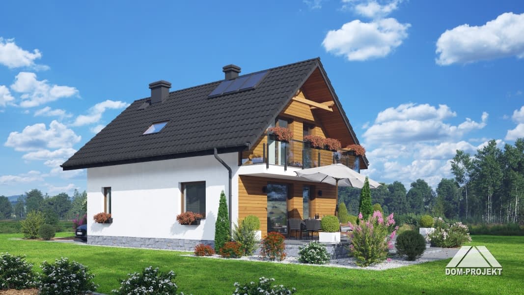 Dom z poddaszem użytkowym. Na parterze salon z aneksem kuchennym, schodami na poddasze oraz wyjściem na taras. Komunikacja, łazienka, pomieszczenie gospodarcze, wiatrołap. Na poddaszu trzy pokoje, łazienka, komunikacja oraz balkon dostępny z dwóch pokoi. Zwarta bryła budynku oraz dach dwuspadowy sprzyjają szybkiej i taniej budowie oraz niskim kosztom eksploatacji.Rzuty