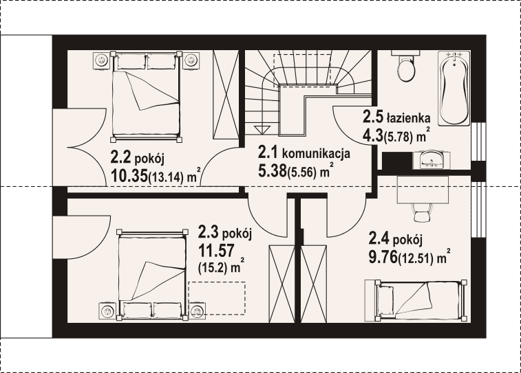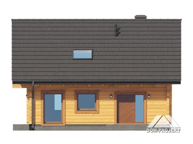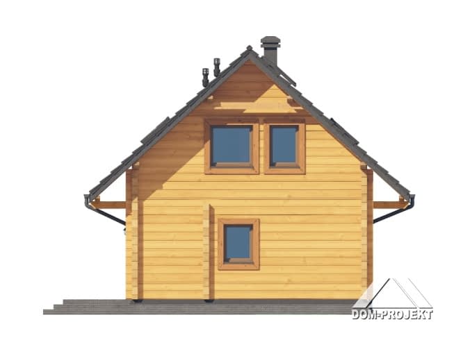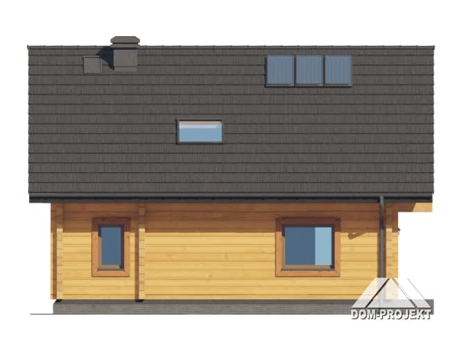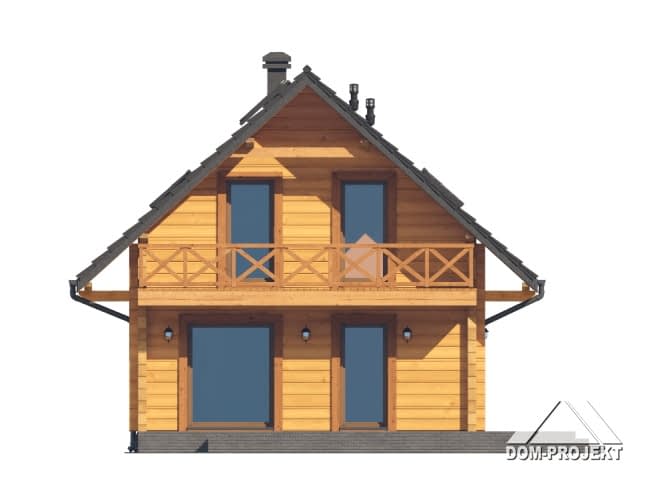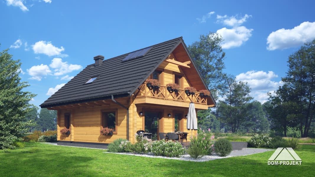 Dom z bali. Na parterze salon z aneksem kuchennym, wyjściem na taras i schodami na poddasze. Komunikacja, wiatrołap, pomieszczenie gospodarcze, łazienka. Na poddaszu trzy pokoje, łazienka, komunikacja oraz balkon dostępny z dwóch pokoi. Zwarta bryła budynku oraz dach dwuspadowy sprzyjają szybkiej i taniej budowie oraz niskim kosztom eksploatacji.Rzuty