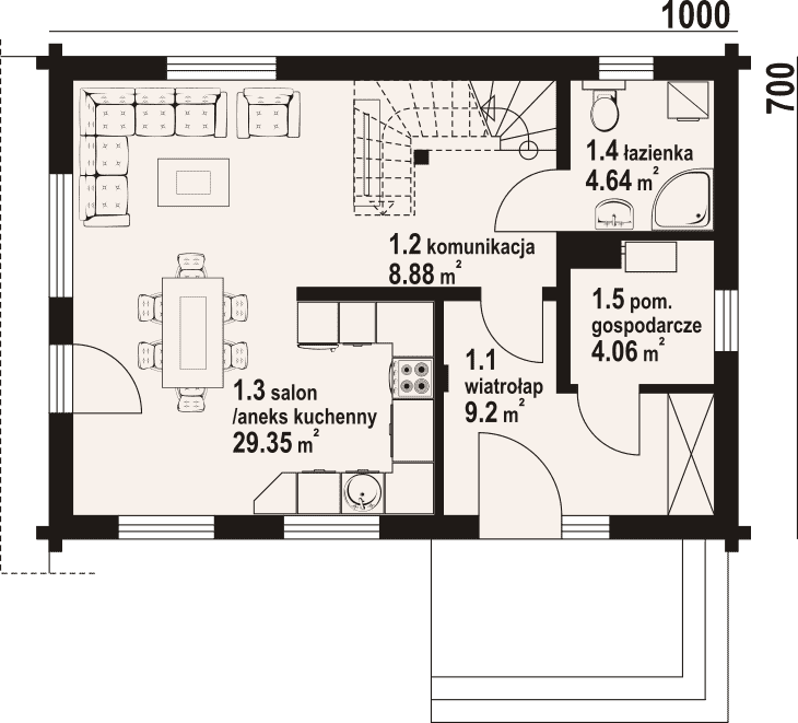 - 1.3 - salon z aneksem kuchennym29.35 m²