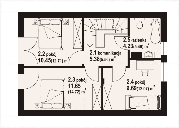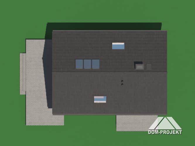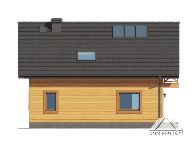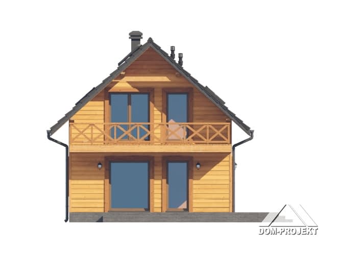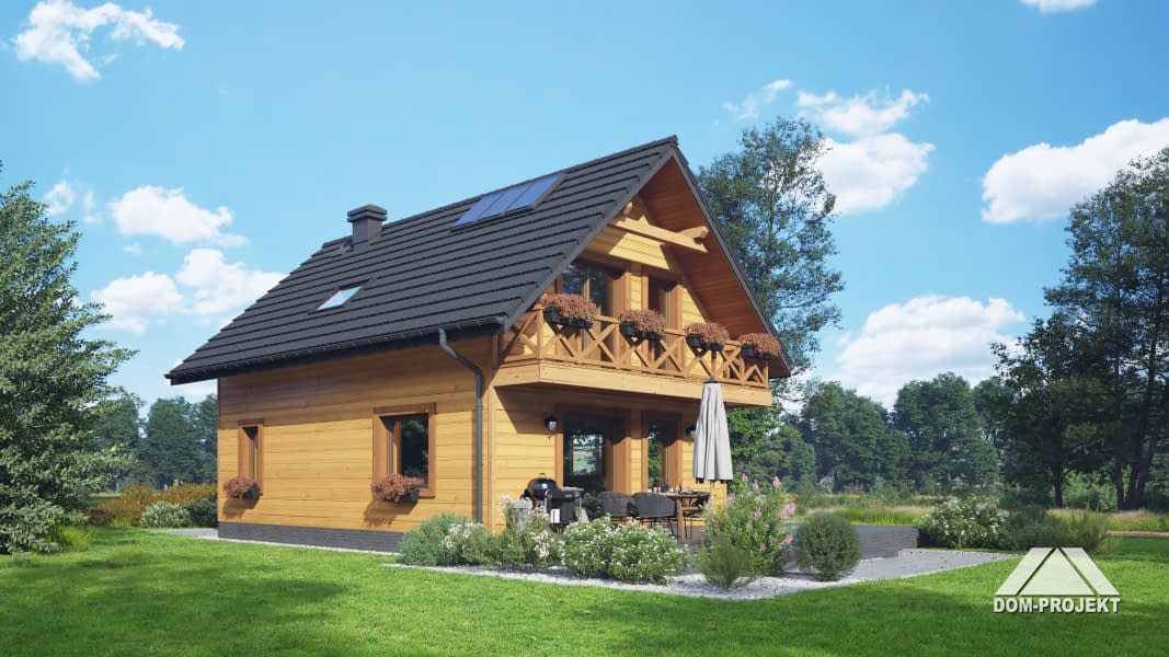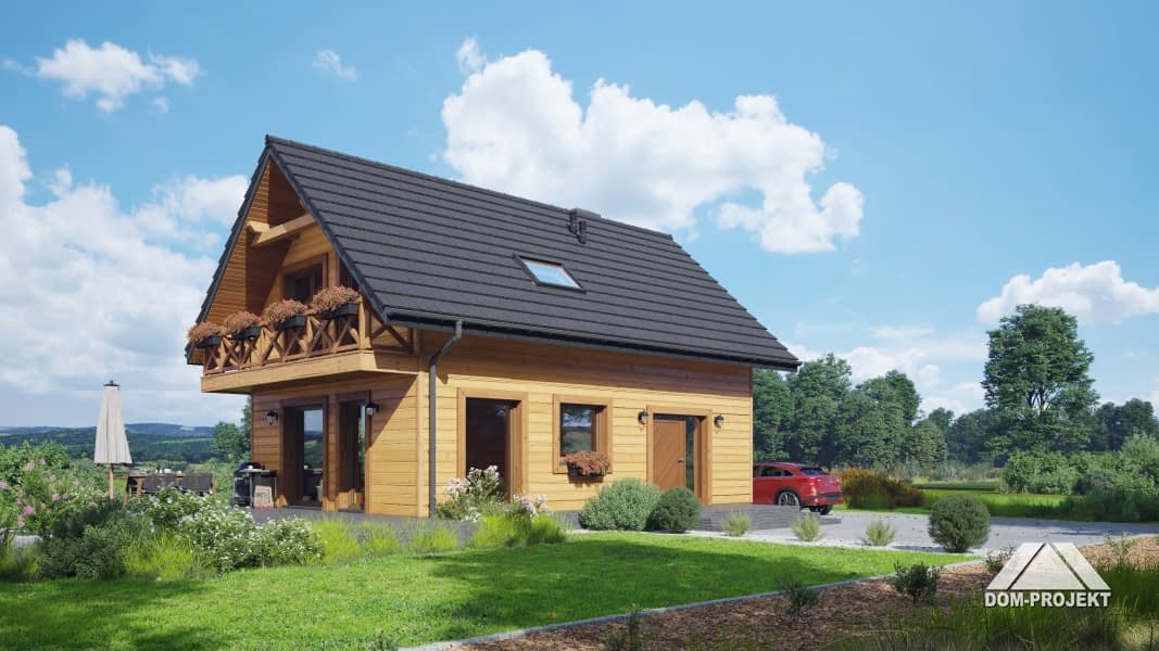 Dom w konstrukcji szkieletu drewnianego. Na parterze salon z aneksem kuchennym, wyjściem na taras i schodami na poddasze. Łazienka, komunikacja, wiatrołap, pomieszczenie gospodarcze. Na poddaszu trzy pokoje, łazienka, komunikacja oraz balkon dostępny z dwóch pokoi. Zwarta bryła budynku oraz dach dwuspadowy sprzyjają szybkiej i taniej budowie oraz niskim kosztom eksploatacji.Rzuty