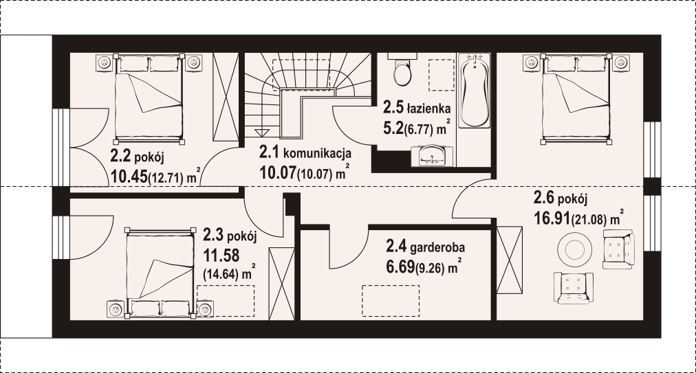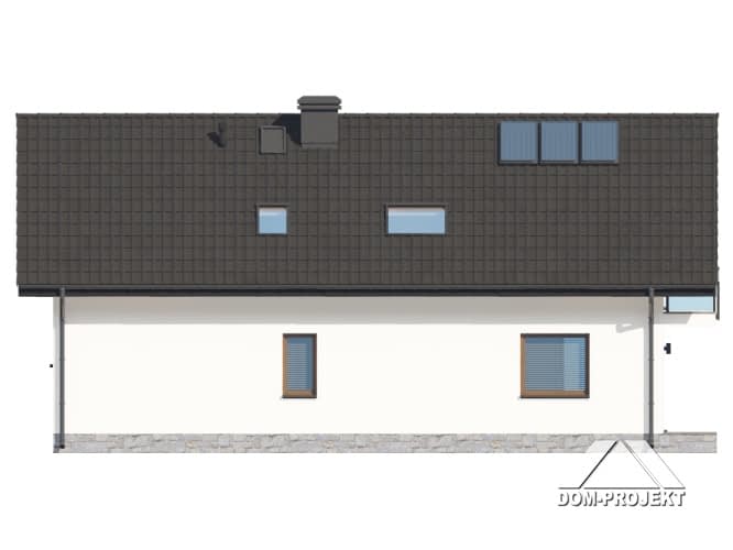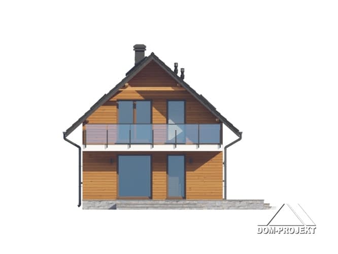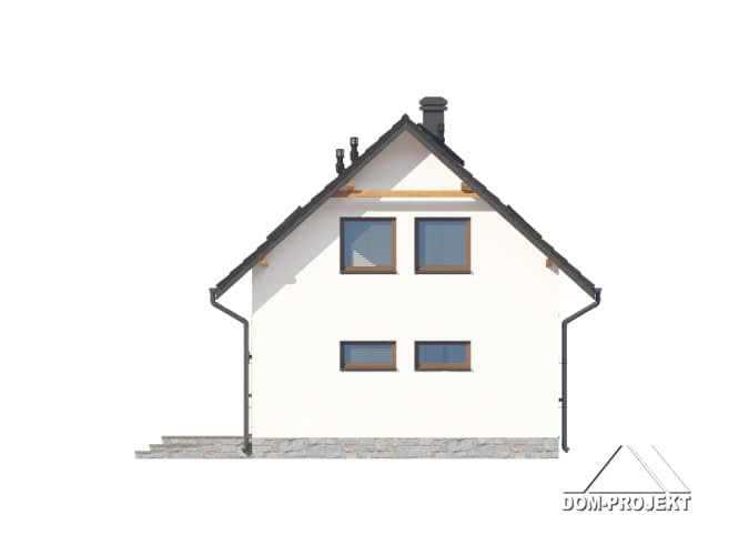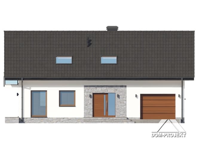Dom z poddaszem użytkowym. Na parterze salon z aneksem kuchennym, wyjściem na taras i schodami na poddasze. Łazienka, pomieszczenie gospodarcze, wiatrołap, komunikacja oraz garaż. Na poddaszu trzy pokoje, łazienka, komunikacja, garderoba oraz balkon dostępny z dwóch pokoi. Zwarta bryła budynku oraz dach dwuspadowy sprzyjają szybkiej i taniej budowie oraz niskim kosztom eksploatacji.Rzuty