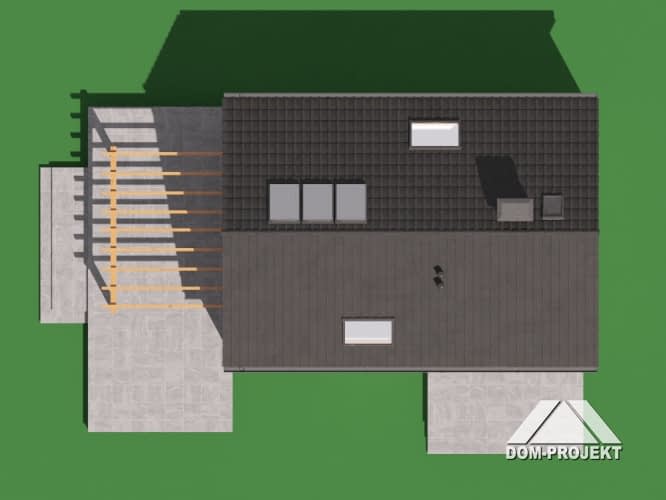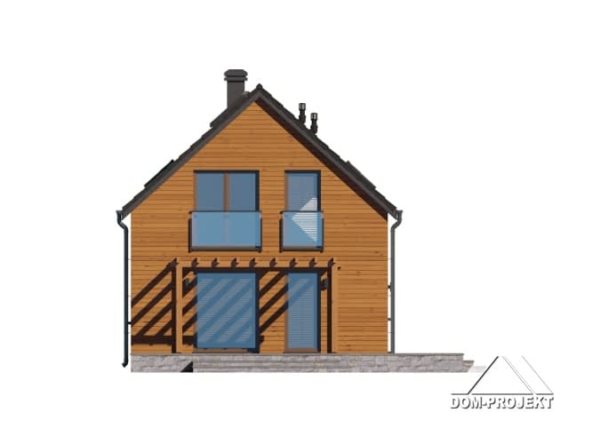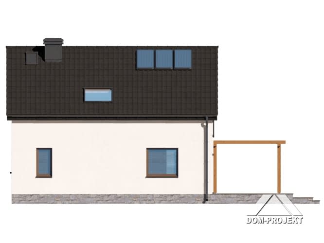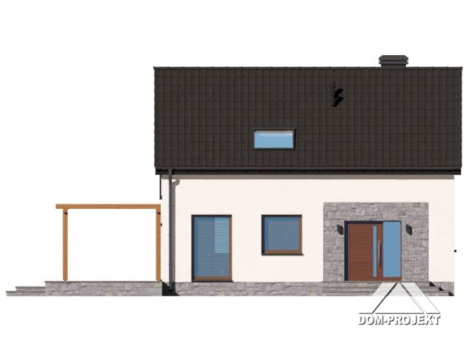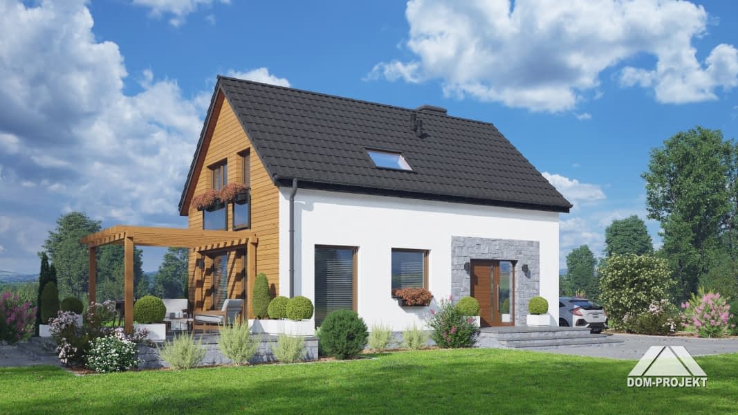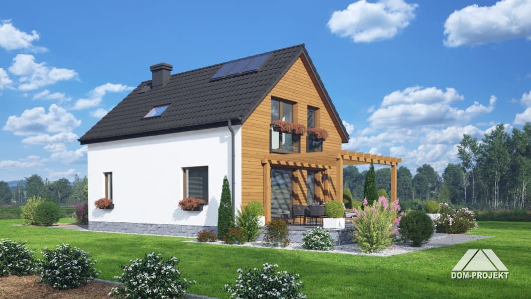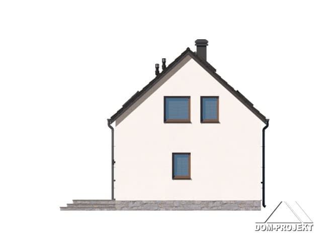 Dom z poddaszem użytkowym. Na parterze salon z aneksem kuchennym, kominkiem, wyjściem na taras i schodami na poddasze. Komunikacja, łazienka, pomieszczenie gospodarcze, wiatrołap. Na poddaszu trzy pokoje, łazienka, komunikacja. Zwarta bryła budynku oraz dach dwuspadowy sprzyjają szybkiej i taniej budowie oraz niskim kosztom eksploatacji.Rzuty
