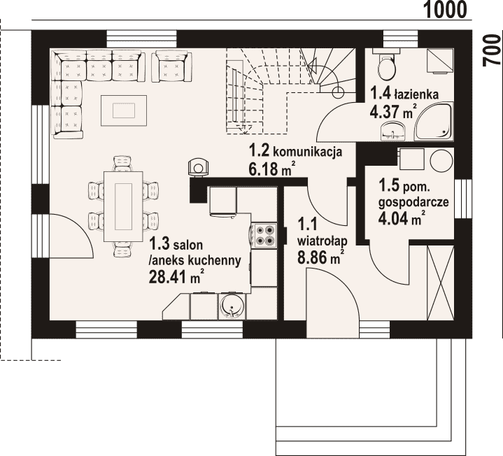 - 1.3 - salon z aneksem kuchennym28.41 m²