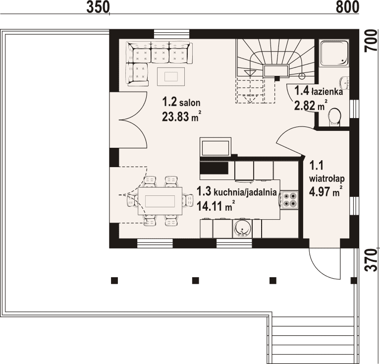 Dom w konstrukcji szkieletu drewnianego. Podpiwniczony. Na parterze duży salon z aneksem kuchennym, kominkiem i wyjściami na duży taras, łazienka, wiatrołap. Na poddaszu trzy pokoje, łazienka i komunikacja. W piwnicy: pralnia, kotłownia, piwnice. Zwarta bryła budynku i dach dwuspadowy sprzyjają szybkiej i taniej budowie i niskim kosztom eksploatacji.Rzuty