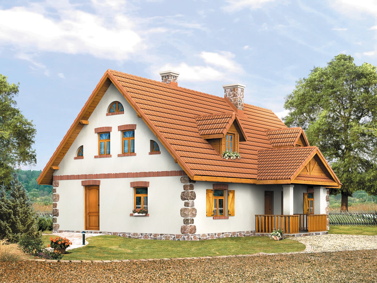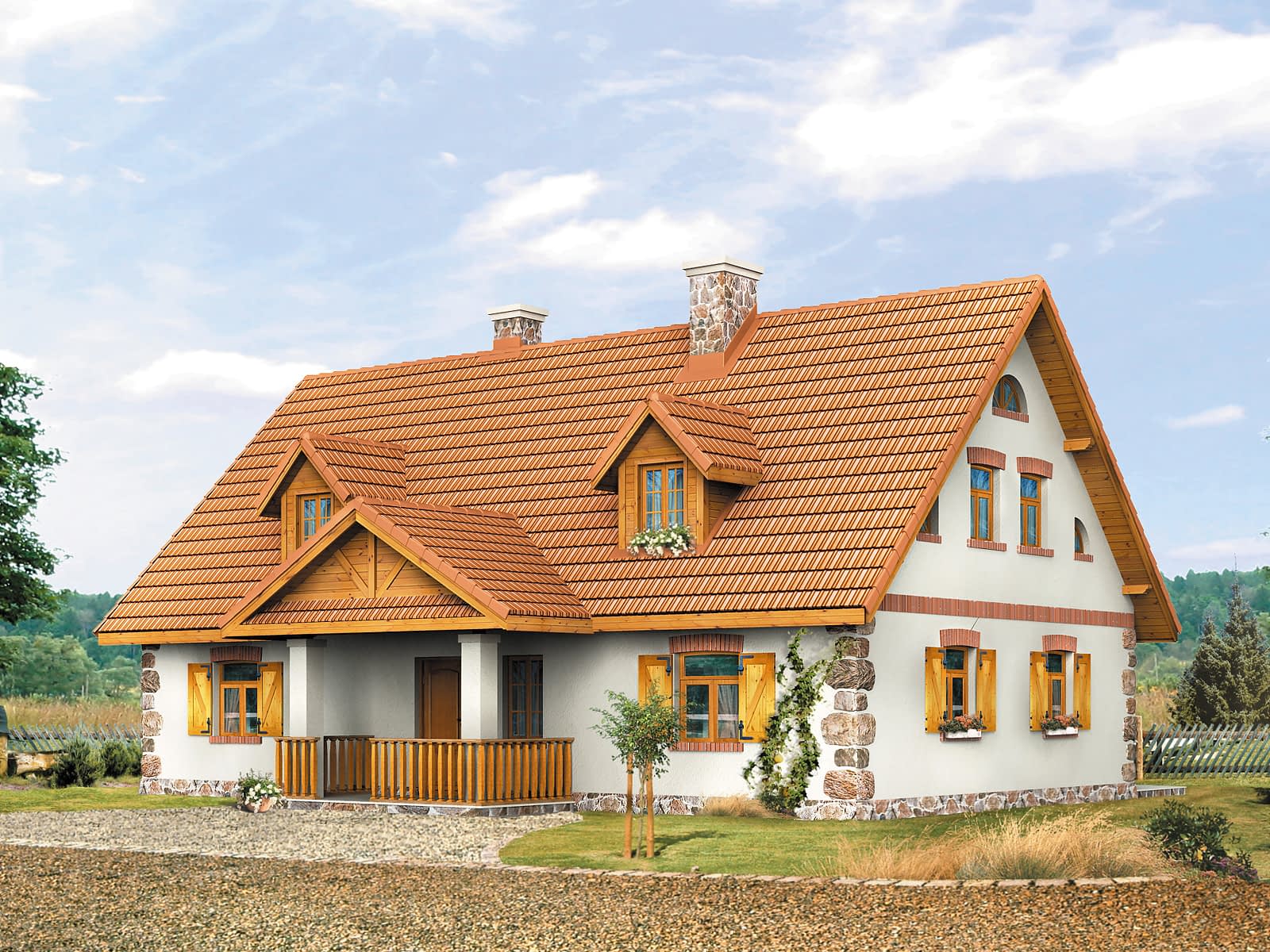 Dom parterowy z poddaszem użytkowym, podpiwniczony, dla 4 – 5-osobowej rodziny. Na parterze zaprojektowano pomieszczenia tzw. strefy dziennej: pokój, dużą jadalnię, kuchnię i łazienkę. Na poddaszu znajdują się pomieszczenia strefy nocnej – cztery sypialnie i dwie łazienki.Konstrukcja