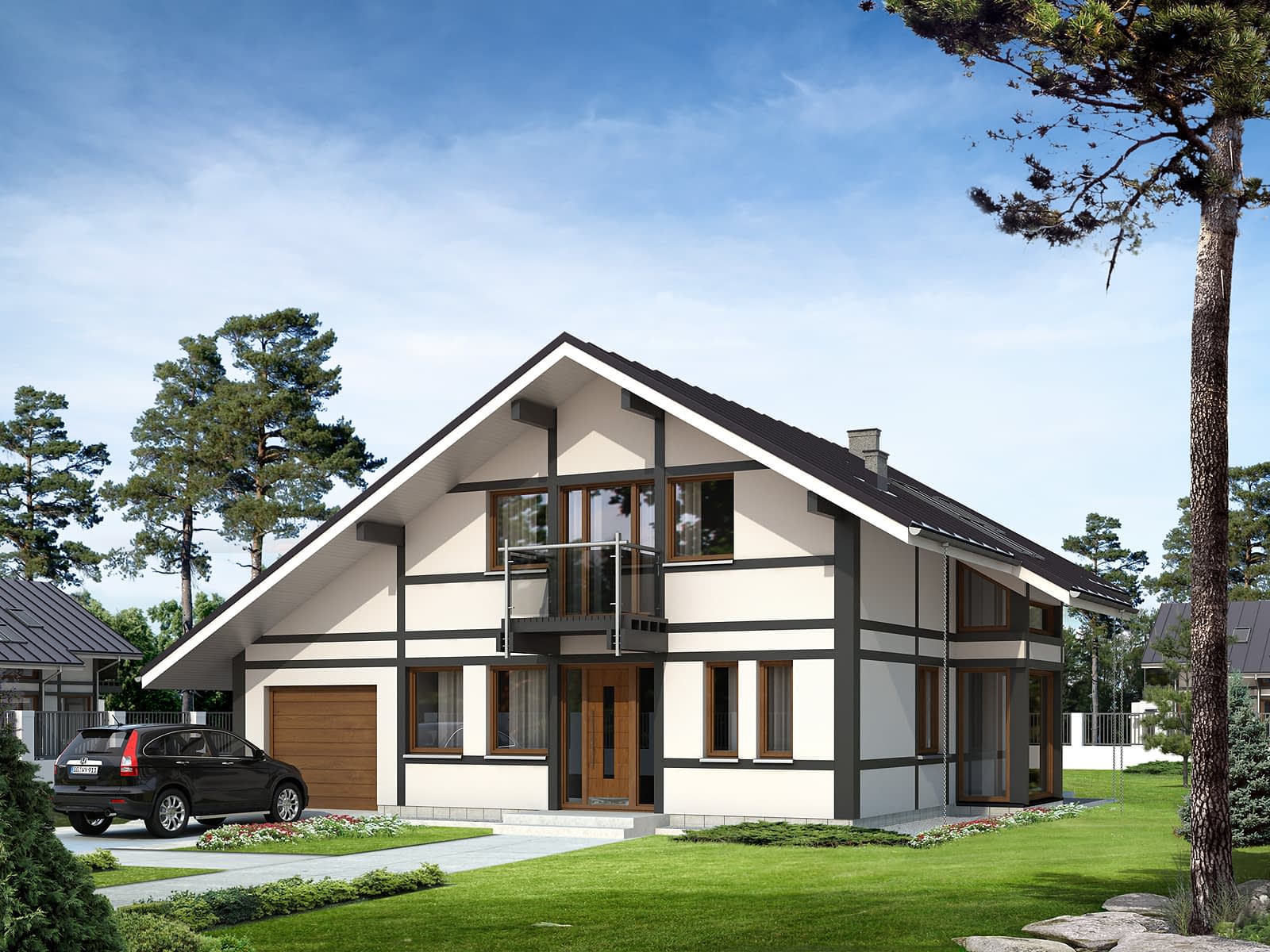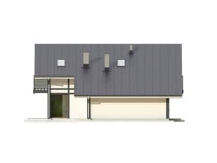 Budynek przeznaczony dla rodziny 4 – 5-osobowej. Zwarta bryła domu oparta na planie prostokąta rozbudowana została o przeszkloną jadalnię i dostawioną bryłę garażu. Charakter domu kształtują drewniane elementy elewacji. Wygodę codziennego użytkowania zapewniają liczne pomieszczenia dodatkowe: pomieszczenie gospodarcze, spiżarnia, garderoby.Konstrukcja