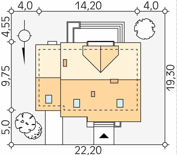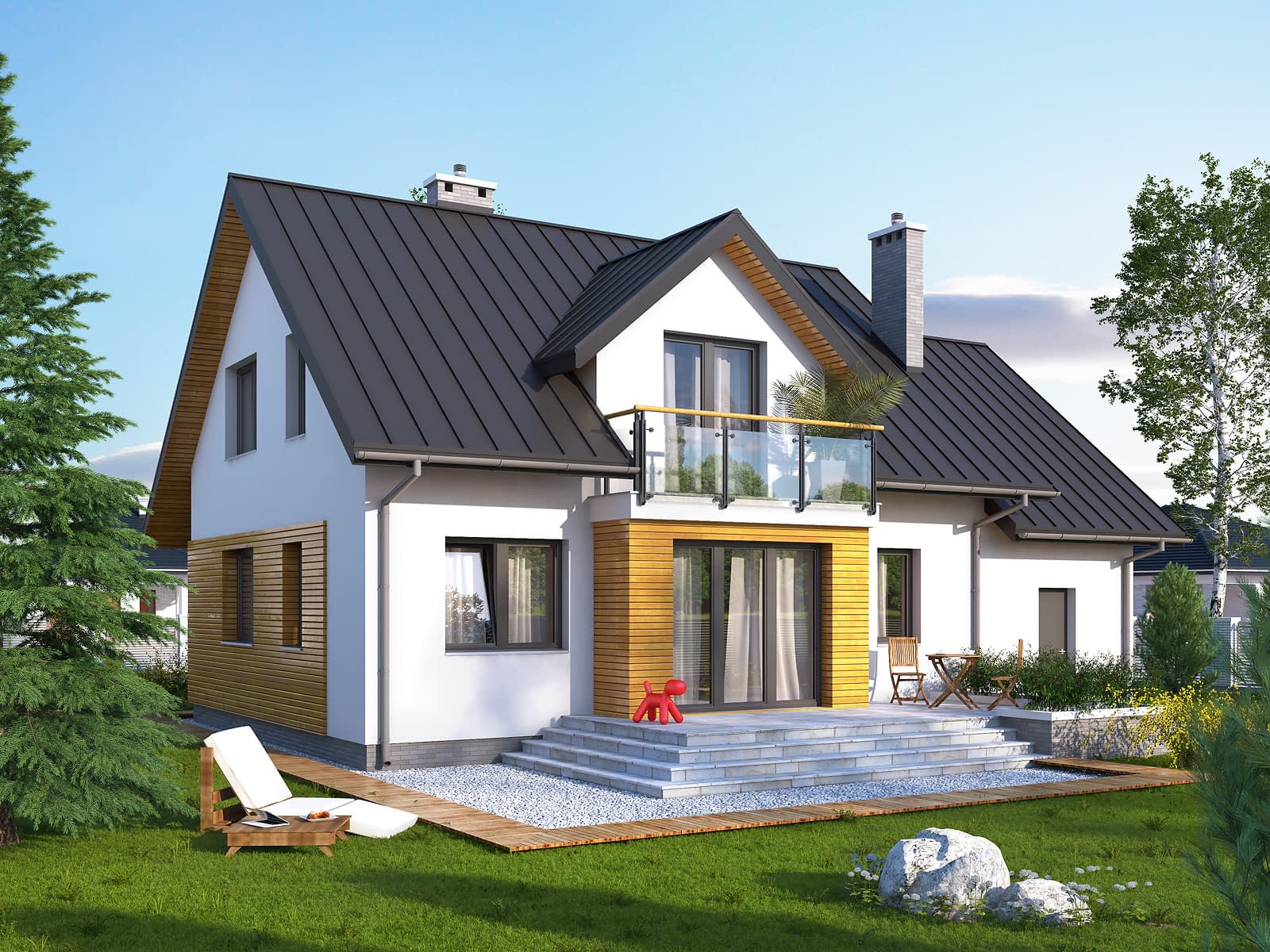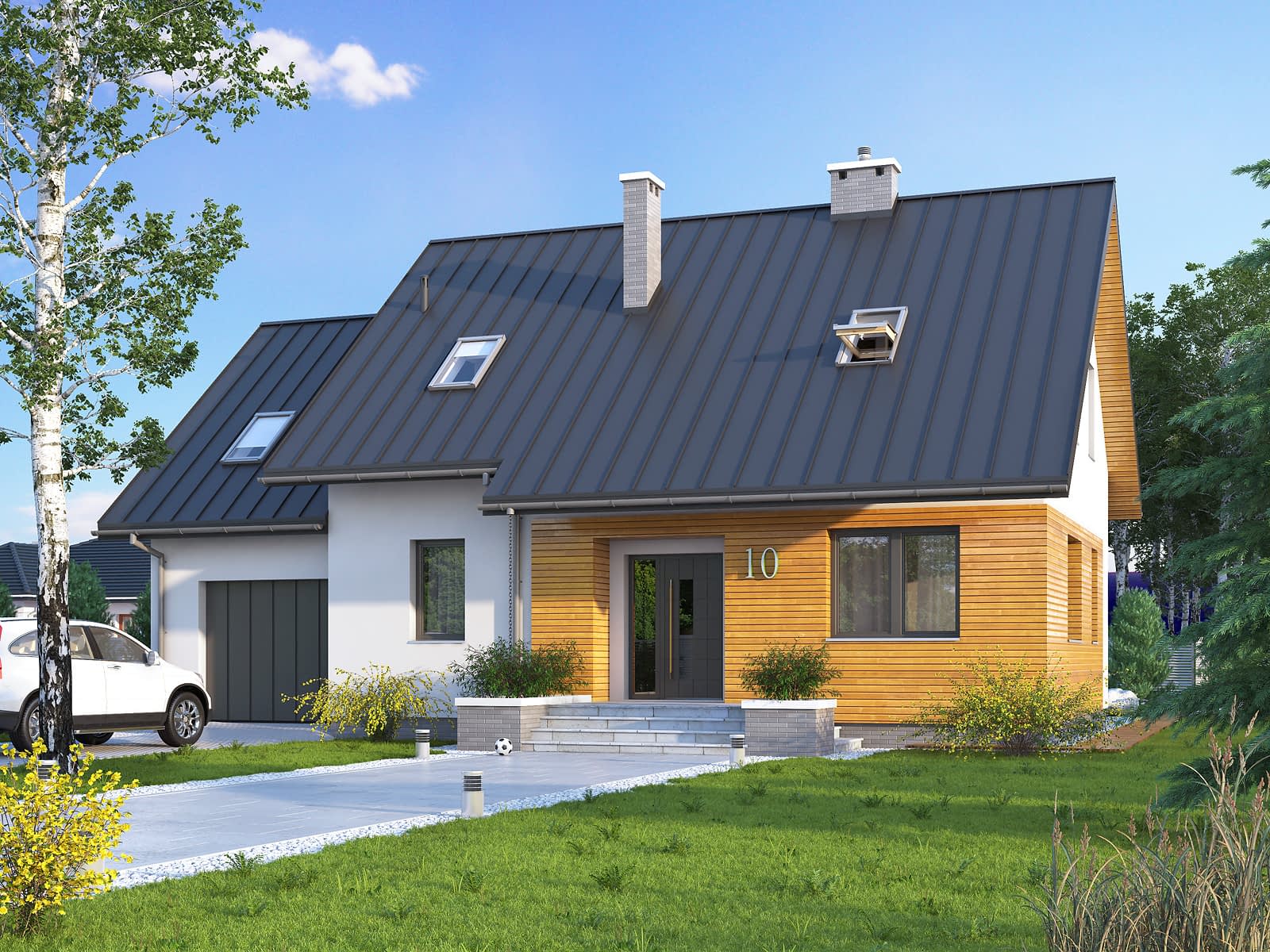 Jednorodzinny budynek mieszkalny z użytkowym poddaszem, przeznaczony dla 4-osobowej rodziny. Na parterze w części dziennej przewidziano przestronny salon z jadalnią. Na niższej kondygnacji domu zaprojektowano kuchnię, garderobę, łazienkę, a w części gospodarczej garaż i kotłownię. Na poddaszu przewidziano trzy sypialnie oraz łazienkę.Konstrukcja