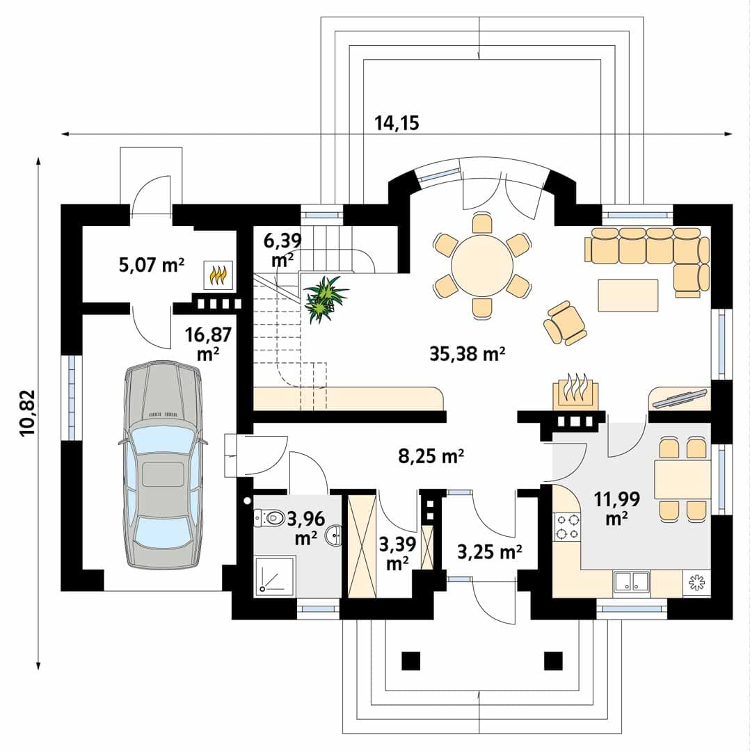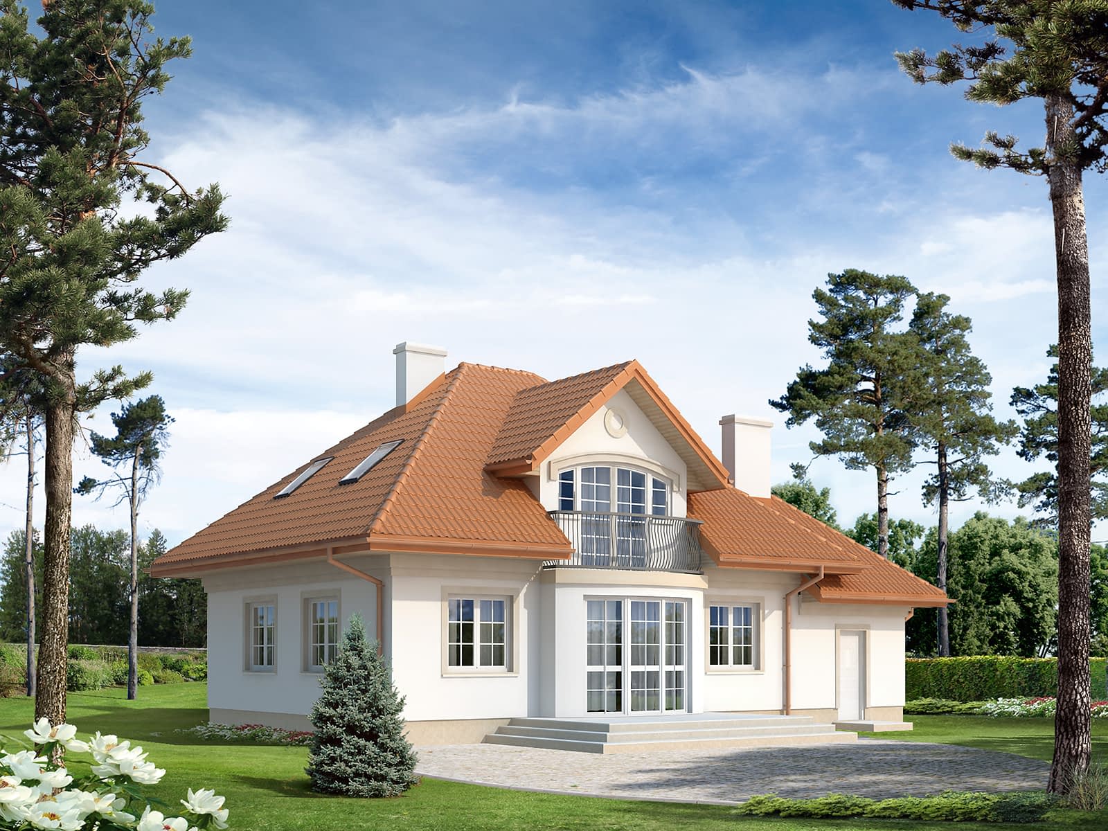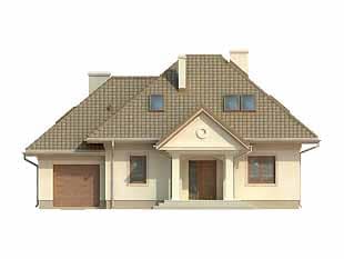 Nieduży dom parterowy z poddaszem użytkowym i jednostanowiskowym garażem. Na parterze zaprojektowano przestronny pokój dzienny, przy którym znajduje się zamknięta kuchnia. Przy wejściu garderoba i nieduża łazienka. Na poddaszu znajdują się trzy sypialnie i łazienka.Konstrukcja