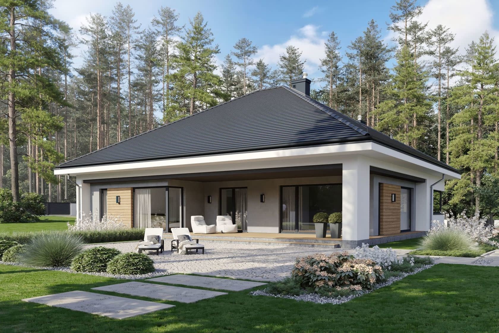 Dom charakteryzuje się zwartą bryłą w kolorach szarości i bieli przełamanymi wstawkami z okładziny z drewna.