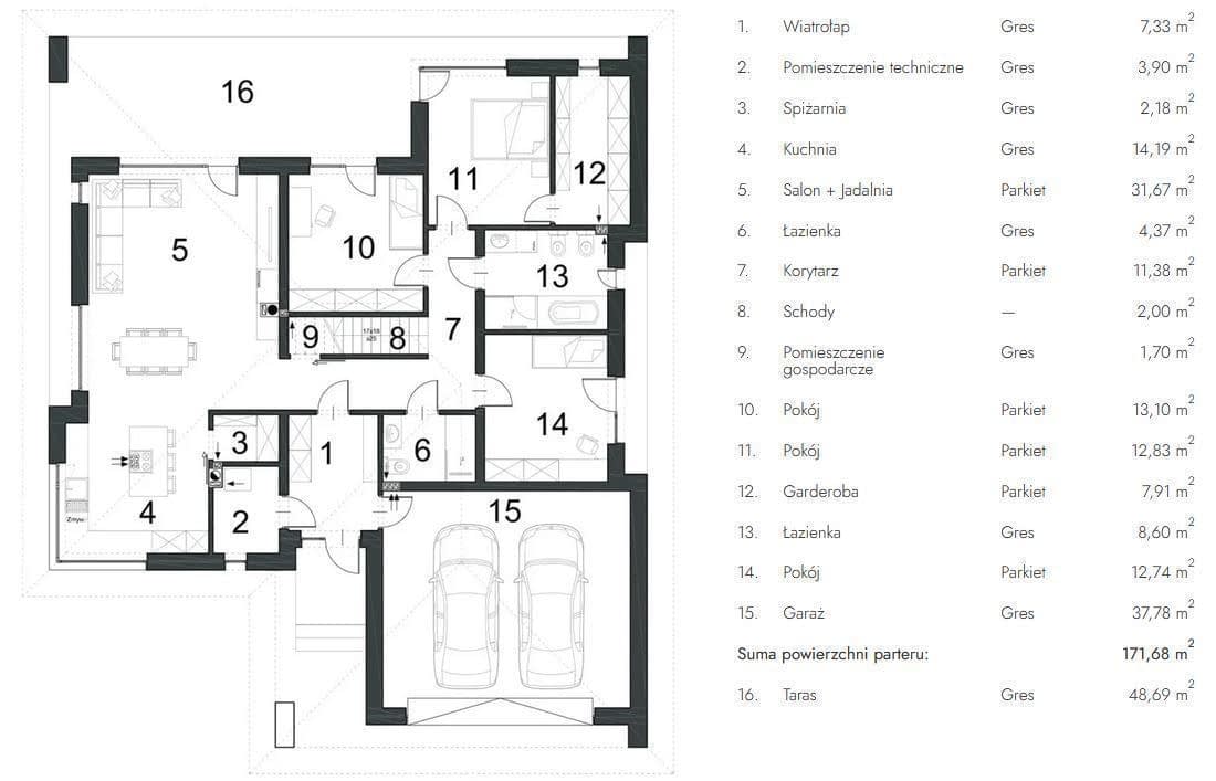 Strefa techniczna to dwustanowiskowy garaż z wejściem z wiatrołapu oraz pomieszczenie techniczne.