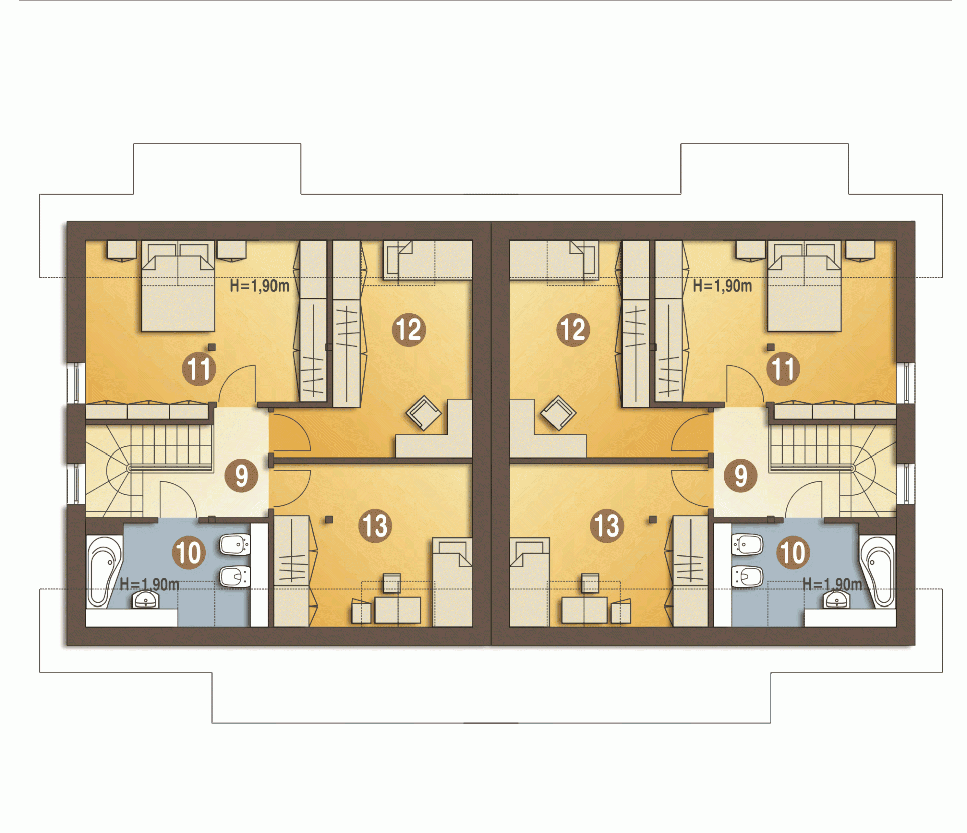 (Uwaga: projekty typu bliźniak oferujemy jako domy dwulokalowe, projekt można zamówić również w zabudowie bliźniaczej)Projekt gotowy Szczęśliwa II zawiera w swoim programie na parterze wiatrołap, hol, kuchnię, WC, garaż, kotłownię salon. Na piętro dostać się można przez wygodne schody. Tu wokół przedpokoju zaprojektowano trzy sypialnie i łazienkę. Szczęśliwa II to projekt domu o niewielkich gabarytach i wybitnie prostej formie przez co z pewnością będzie tani w budowie i eksploatacji.
