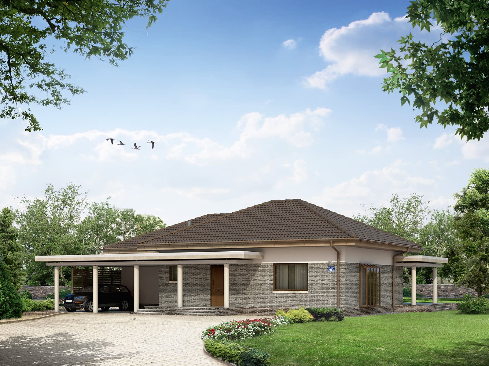 Dom mieszkalny jednorodzinny przeznaczony dla 4-osobowej rodziny. Zaprojektowano czytelny, funkcjonalny układ parteru. Wyraźnie oddzielona część nocna od części dziennej z osobną łazienką dla rodziców. Istnieje możliwość zabudowania wiaty garażowej.Konstrukcja