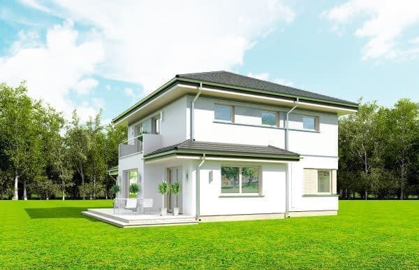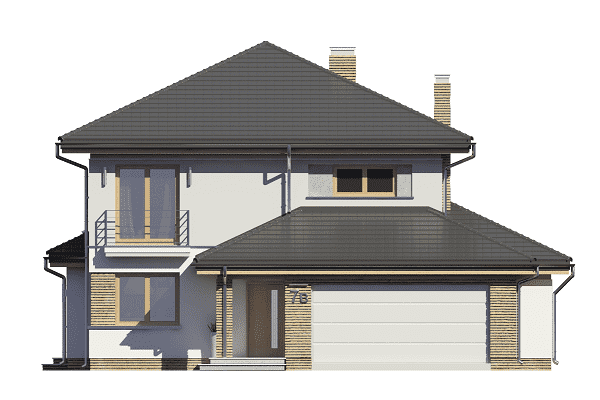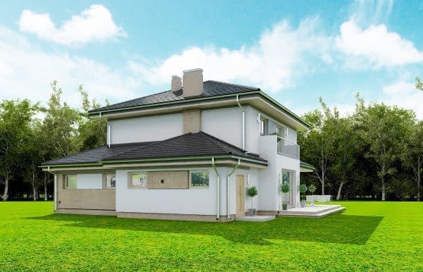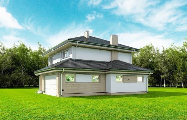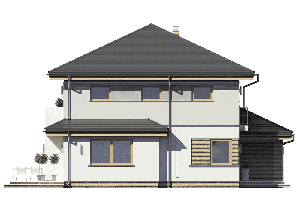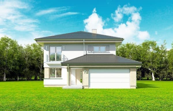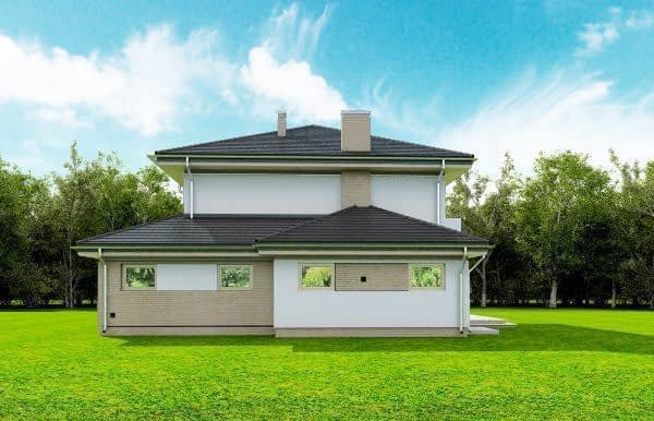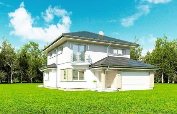Projekt domu Szmaragd 4 jest wariantową wersją popularnego projektu typu Szmaragd. Dom jest zaprojektowany dla rodziny 4-5 osobowej. Jest to piętrowy budynek, zbudowany na planie kwadratu przekrytego kopertowym dachem, z wbudowanym w bryłę garażem, z parterowymi dobudówkami i wykuszami. Niewielka powierzchnia domu została zamknięta w atrakcyjnej nowoczesnej bryle, z ładnymi przeszkleniami i urozmaiconymi elewacjami. Wnętrze domu podzielono na część dzienną i gospodarczą na parterze, oraz sypialnie na piętrze. Na dole zaprojektowaliśmy obszerny pokój dzienny, lekko odgrodzony od jadalni i kuchni, oraz holu. Schody na piętro są ozdobą salonu i holu. Całość tworzy jednoprzestrzenne duże wnętrze, otwarte szerokimi przeszkleniami na ogród i taras. Dwustanowiskowy garaż dostępny z przedsionka ma dodatkowo dwa pomieszczenia gospodarcze – w tym kotłownię. Na piętrze przewidziano trzy sypialnie ( rodziców – z garderobą i dziecinne – z szafami wbudowanymi ), dużą rodzinną łazienkę, oraz dodatkowe pomieszczenie - pokój lub garderobę. Nad piętrem znajduje się strych – magazyn. Dom został zaprojektowany z uwzględnieniem rozwiązań energooszczędnych. Późniejsza eksploatacja Szmaragda 4 nie powinna być kosztowna. Budowa samego domu również nie powinna przysporzyć wielu problemów – dom jest dość prosty, ma nieskomplikowaną konstrukcję, zwartą bryłę. Projekt domu Szmaragd 4 do projekt w sam raz dla osób, które cenią sobie dobrą architekturę i ładny efekt, ale jednocześnie nie chcą wydać na swój przyszły dom fortuny. Dostępna jest także wersja domu w odbiciu lustrzanym, wersja podstawowa (projekt domu Szmaragd), bliźniak (projekt domu Szmaragd 2), wersja największa z dodatkowym pokojem na parterze (projekt szmaragd 3) oraz najnowsze (projekt domu Szmaragd 5), (projekt domu Szmaragd 6).