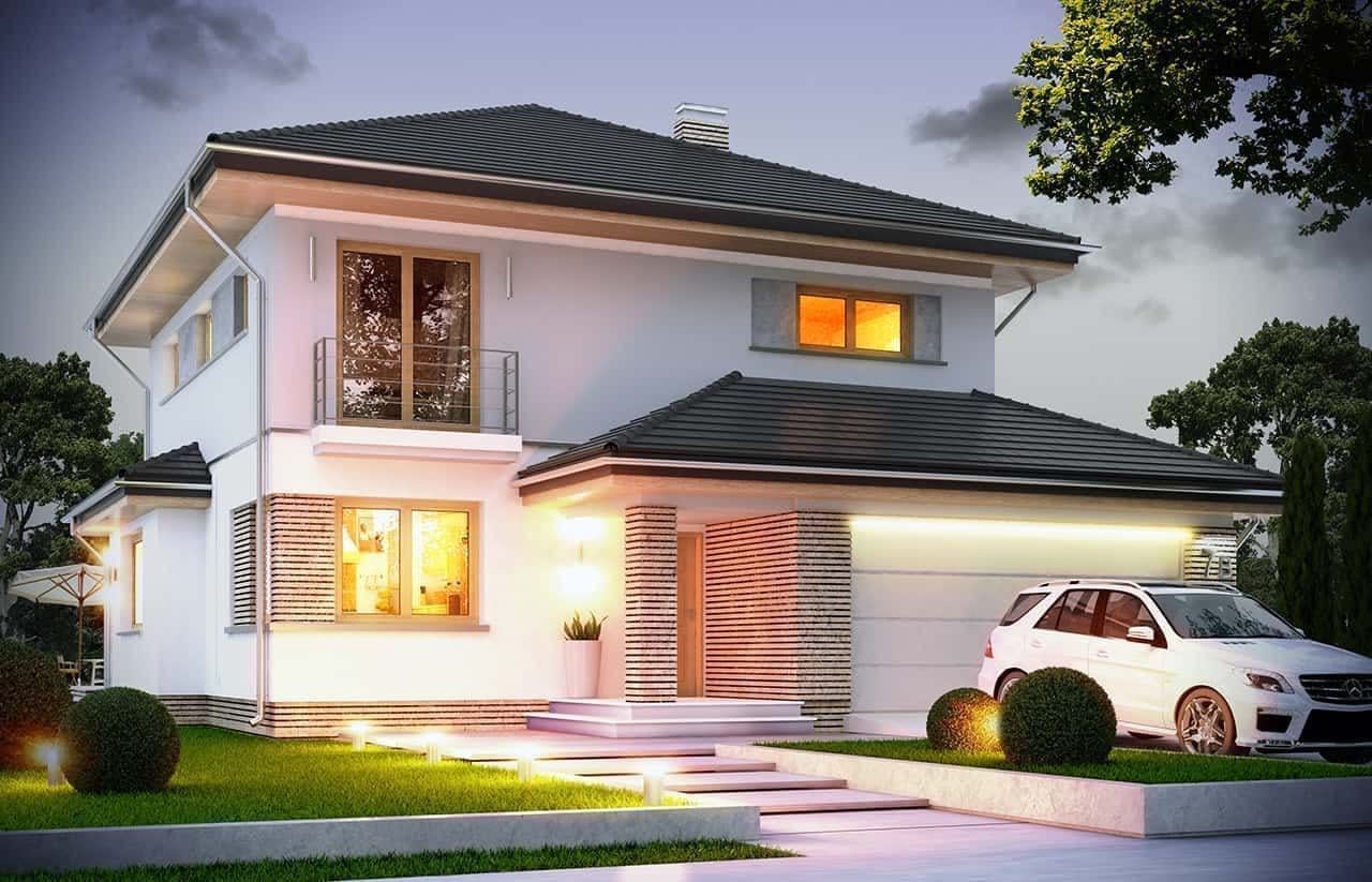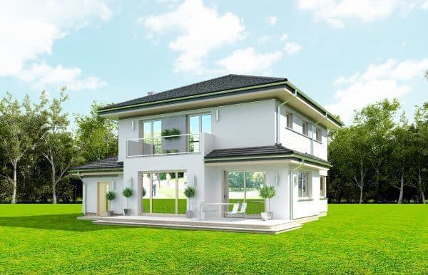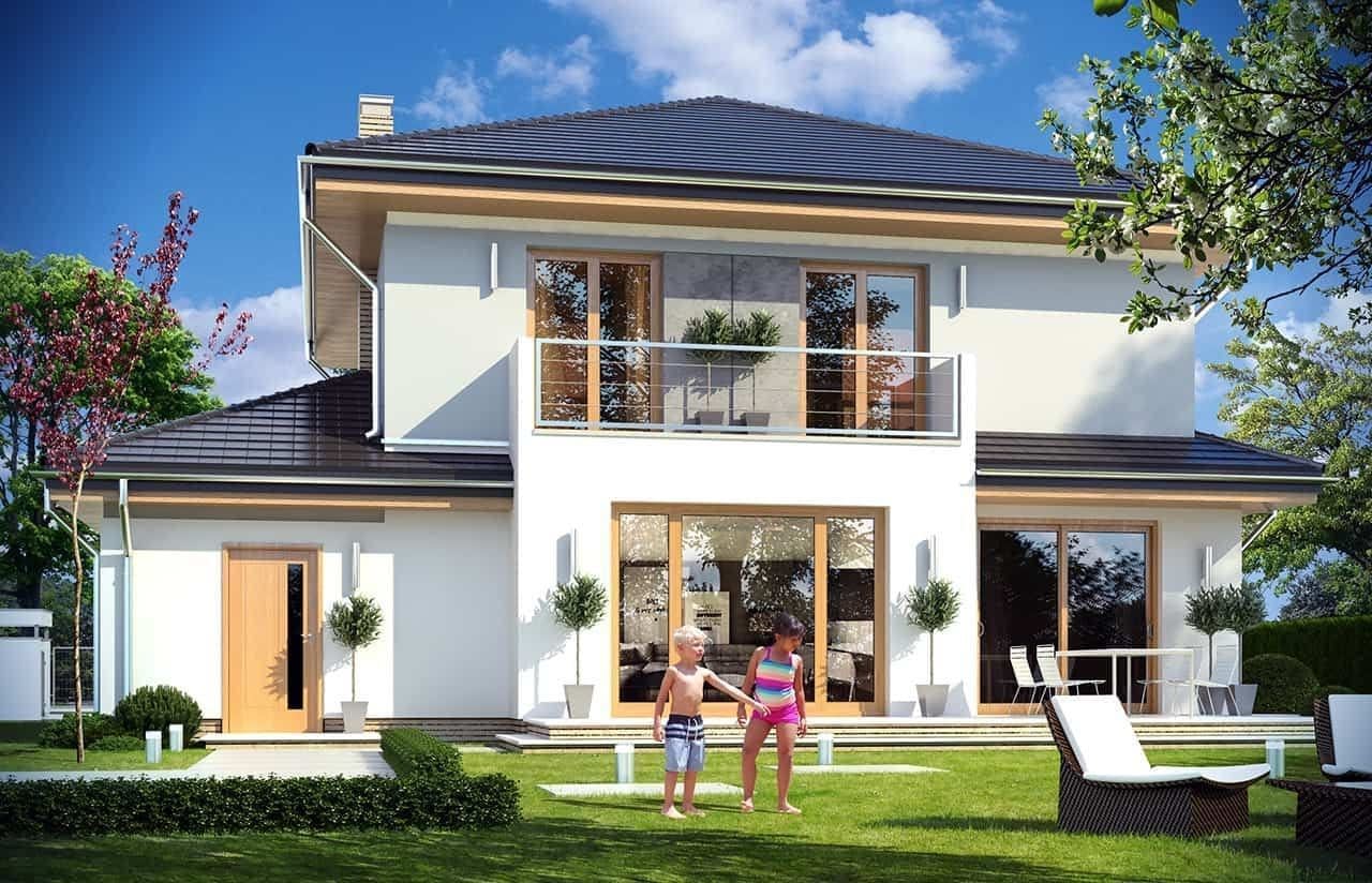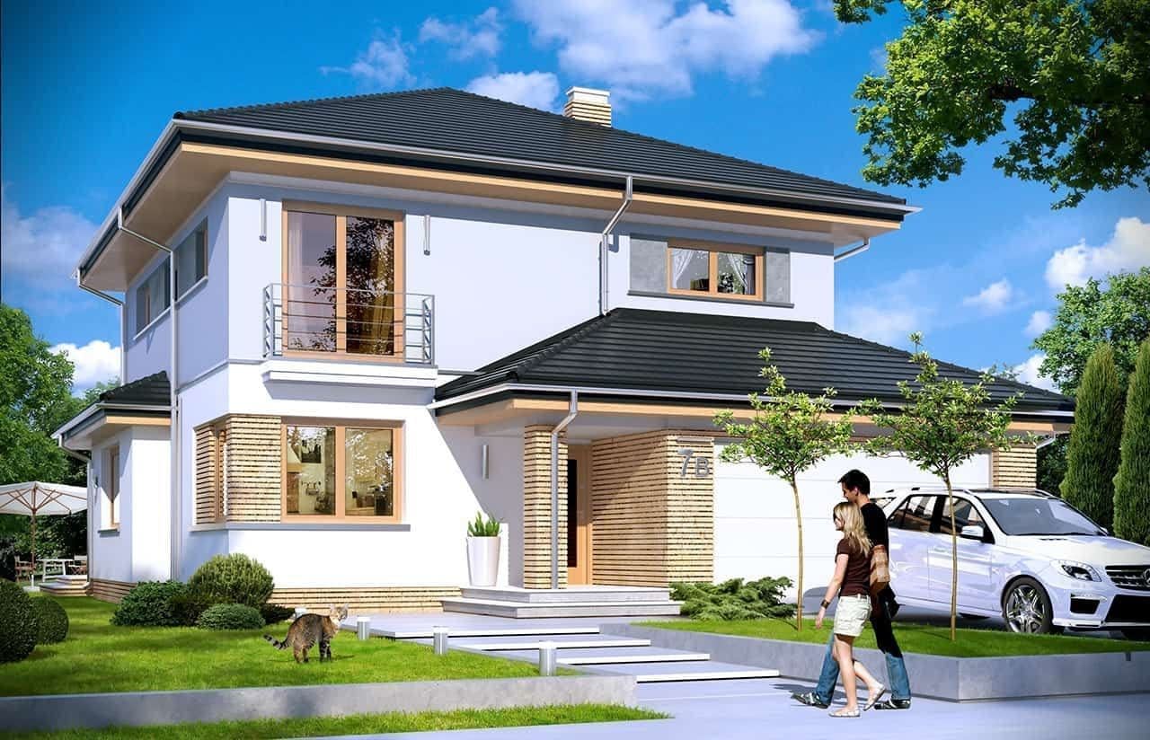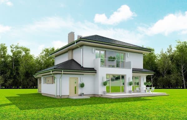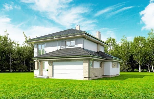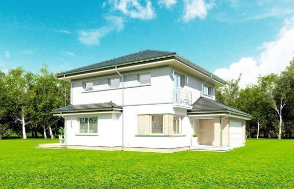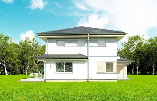 Projekt domu Szmaragd 4 jest wariantową wersją popularnego projektu typu Szmaragd. Dom jest zaprojektowany dla rodziny 4-5 osobowej. Jest to piętrowy budynek, zbudowany na planie kwadratu przekrytego kopertowym dachem, z wbudowanym w bryłę garażem, z parterowymi dobudówkami i wykuszami. Niewielka powierzchnia domu została zamknięta w atrakcyjnej nowoczesnej bryle, z ładnymi przeszkleniami i urozmaiconymi elewacjami. Wnętrze domu podzielono na część dzienną i gospodarczą na parterze, oraz sypialnie na piętrze. Na dole zaprojektowaliśmy obszerny pokój dzienny, lekko odgrodzony od jadalni i kuchni, oraz holu. Schody na piętro są ozdobą salonu i holu. Całość tworzy jednoprzestrzenne duże wnętrze, otwarte szerokimi przeszkleniami na ogród i taras. Dwustanowiskowy garaż dostępny z przedsionka ma dodatkowo dwa pomieszczenia gospodarcze – w tym kotłownię. Na piętrze przewidziano trzy sypialnie ( rodziców – z garderobą i dziecinne – z szafami wbudowanymi ), dużą rodzinną łazienkę, oraz dodatkowe pomieszczenie - pokój lub garderobę. Nad piętrem znajduje się strych – magazyn. Dom został zaprojektowany z uwzględnieniem rozwiązań energooszczędnych. Późniejsza eksploatacja Szmaragda 4 nie powinna być kosztowna. Budowa samego domu również nie powinna przysporzyć wielu problemów – dom jest dość prosty, ma nieskomplikowaną konstrukcję, zwartą bryłę. Projekt domu Szmaragd 4 do projekt w sam raz dla osób, które cenią sobie dobrą architekturę i ładny efekt, ale jednocześnie nie chcą wydać na swój przyszły dom fortuny. Dostępna jest także wersja domu w odbiciu lustrzanym, wersja podstawowa (projekt domu Szmaragd), bliźniak (projekt domu Szmaragd 2), wersja największa z dodatkowym pokojem na parterze (projekt szmaragd 3) oraz najnowsze (projekt domu Szmaragd 5), (projekt domu Szmaragd 6).