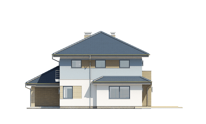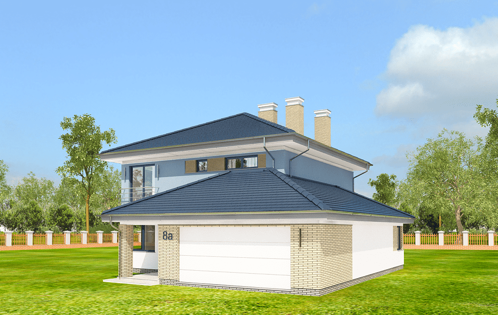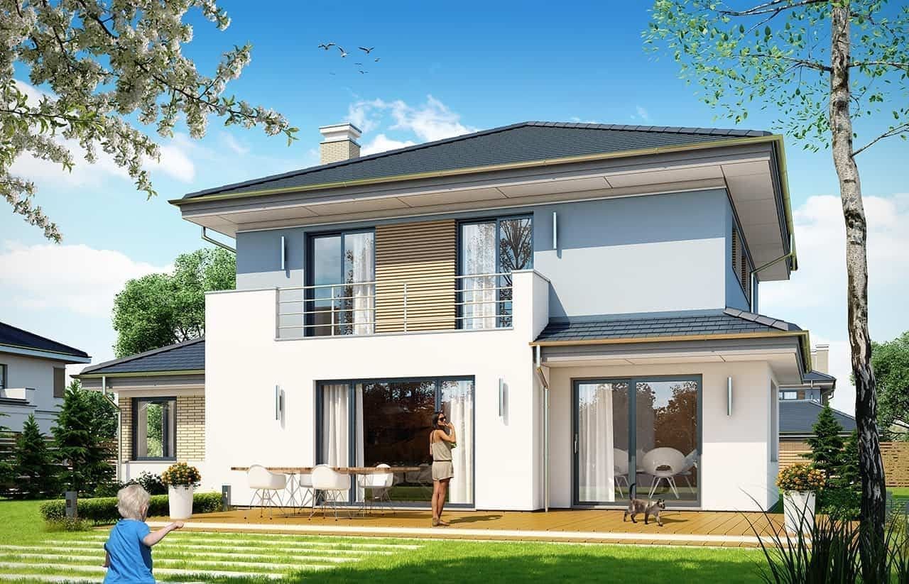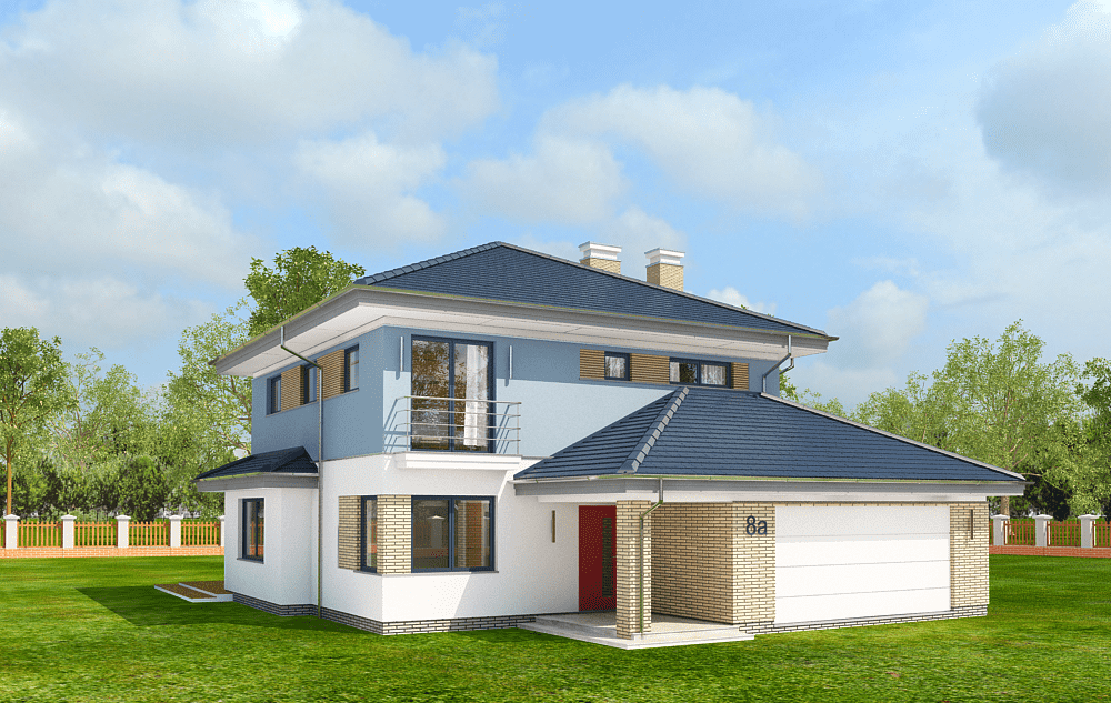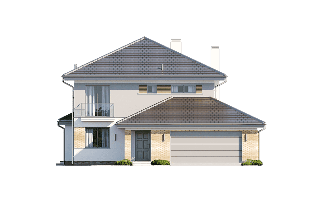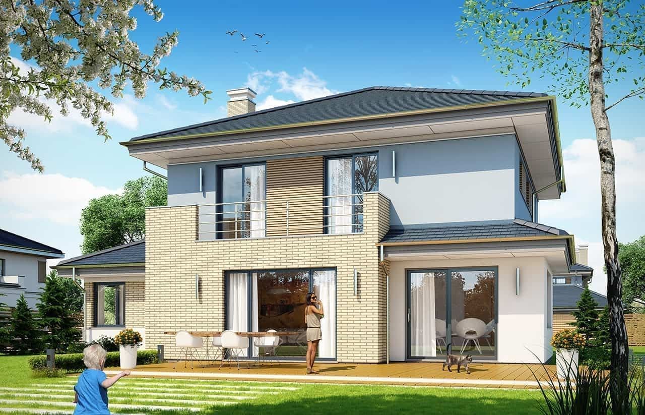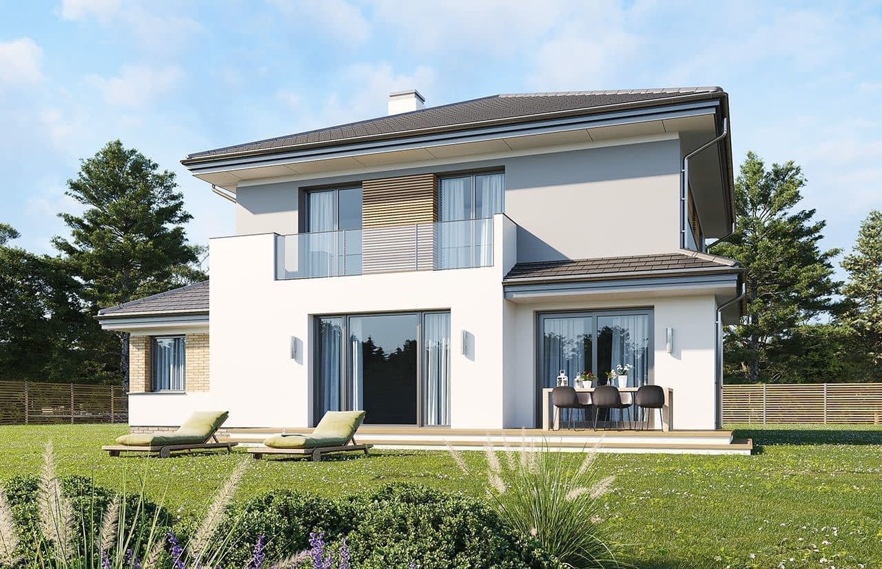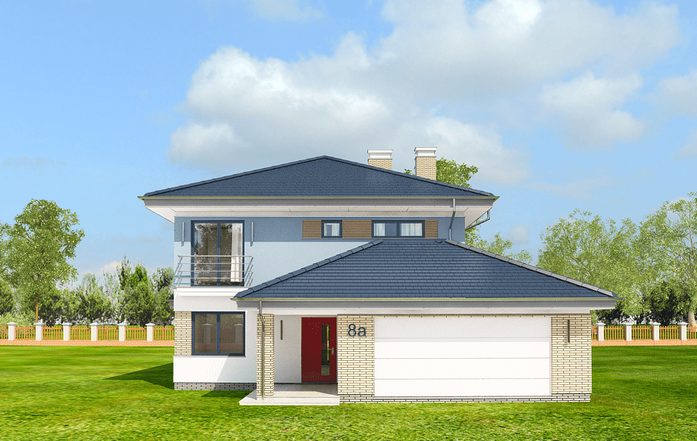 Projekt domu Szmaragd 5 Prezentujemy kolejną wersję wariantową domu z serii Szmaragd. Tym razem jest to Szmaragd 5. Projekt domu jednorodzinnego piętrowego, z garażem częściowo wbudowanym w bryłę. Projekt domu Szmaragd 5 przeznaczony dla 4-5cioosobowej rodziny. Dom ma nowoczesną, ale nie agresywną architekturę. Bryła budynku jest zwarta, przykryta kopertowym dachem. Dzięki temu dom będzie łatwy i niedrogi zarówno w budowie, jak i późniejszym utrzymaniu. Parter domu to otwarta część dzienna, z salonem, holem, jadalnią i otwartą kuchnią. Razem pomieszczenia tworzą dużą wspólną przestrzeń. Dodatkowo na parterze przewidziano pokój - gabinet lub sypialnię gościnną, łazienkę, oraz duży garaż i kotłownię. Przy kuchni zmieściła się niewielka spiżarka. Na piętrze mamy trzy ładne sypialnie (sypialnia rodziców z garderobą), oraz bardzo ładną łazienkę. Jest też dodatkowe pomieszczenie, które może służyć jako pokój, albo domowe biuro, lub pralnię – garderobę. Nad piętrem mamy jeszcze sporej wielkości strych - magazyn domowych rupieci. Projekt domu Szmaragd 5 to komfortowy, wygodny dom. Ma w sobie wszystko czego można potrzebować od prawdziwego domu. Nowoczesny wygląd domu, kolorystyka i materiały tworzą spójną całość z przestronnym wnętrzem. Dom jest energooszczędny. Dobre ocieplenia i nowoczesne instalacje pozwalają go w łatwy sposób przystosować do standardu NF40. Projekt dostępny jest w odbiciu lustrzanym jak i w kilku innych wersjach : wersja bazowa (projekt domu Szmaragd), zbliźniaczona (projekt domu Szmaragd 2), wersja z dodatkowym pokojem na parterze (projekt domu Szmaragd 3), komfortowa ( projekt domu Szmaragd 4), oraz najnowszą (projekt domu Szmaragd 6). Zapraszamy !