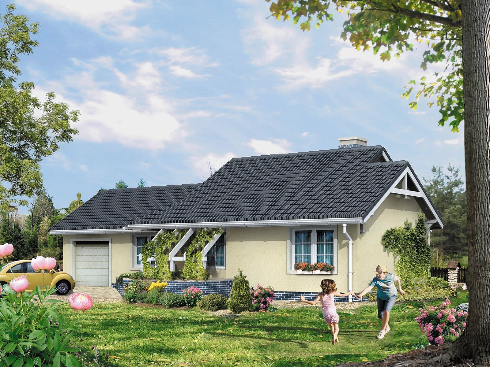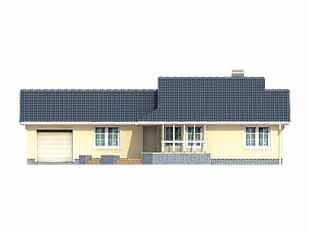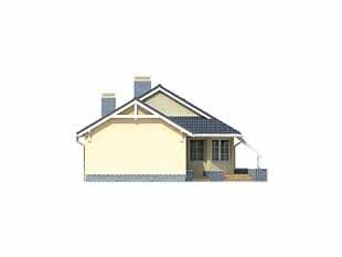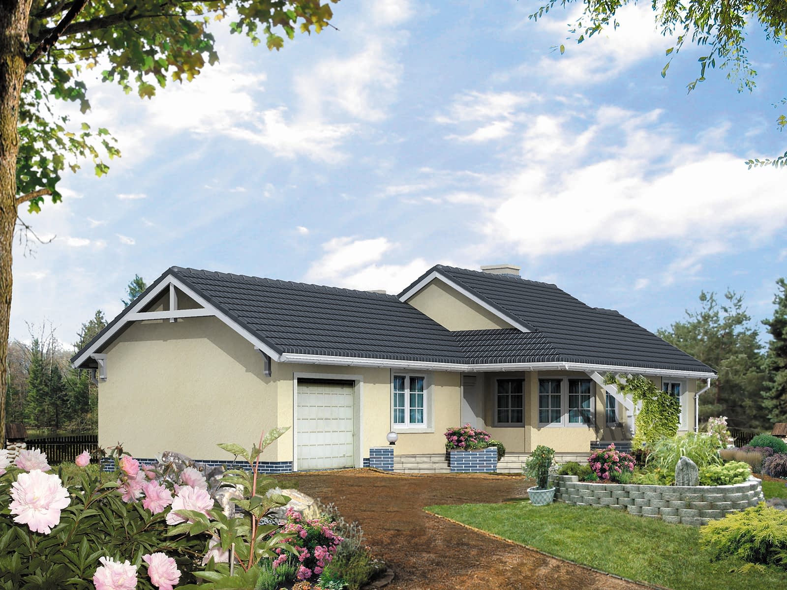 Jednorodzinny dom parterowy, niepodpiwniczony, z garażem w bryle budynku. W części centralnej od strony wejścia zaprojektowano duży pokój dzienny połączony z kuchnią i aneksem jadalnym. Dom posiada trzy sypialnie, w tym jedną z własną łazienką. Przed wejściem zlokalizowano obszerny, częściowo zadaszony taras.Konstrukcja