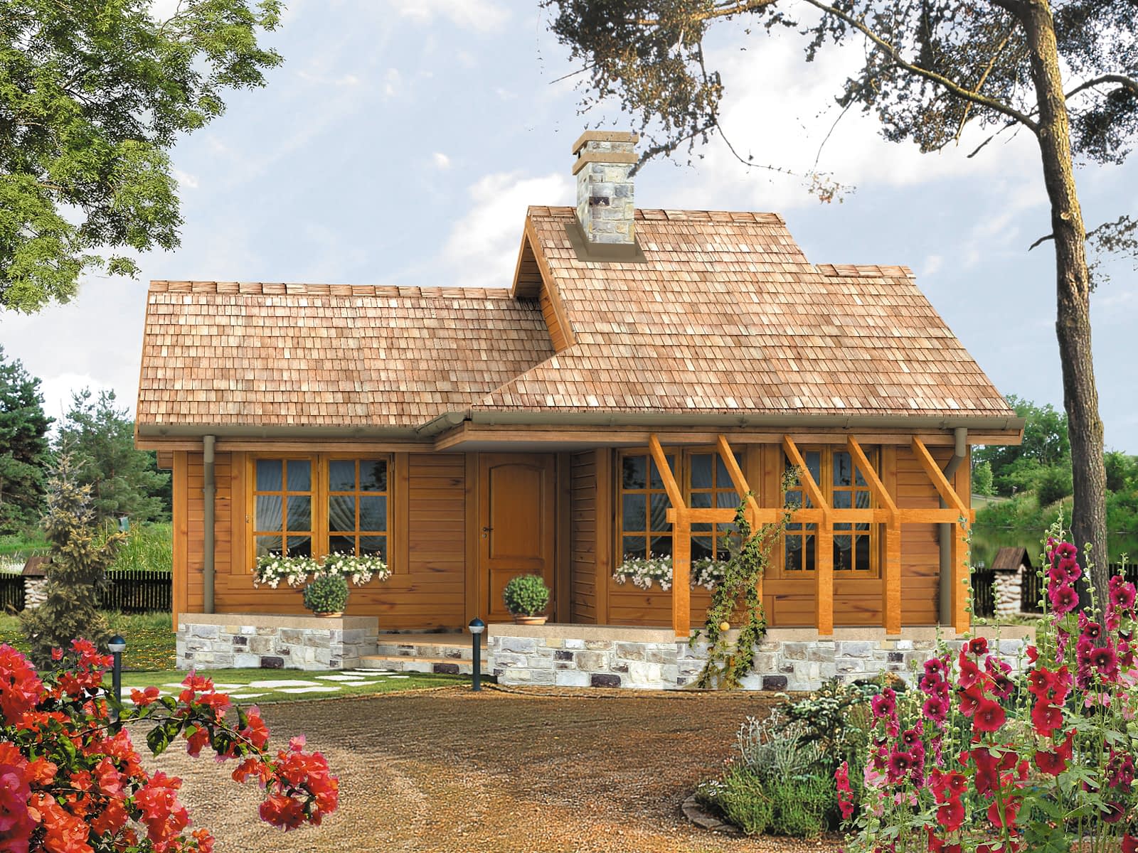 Niewielki dom letniskowy, parterowy, niepodpiwniczony. Na parterze pokój z kominkiem i dwie niewielkie sypialnie. Częściowo zadaszony taras. Istnieje wersja domu jednorodzinnego. Szyper 6 dr-S MIESZKALNY – wersja projektu domu mieszkalnego, jednorodzinnego.Konstrukcja