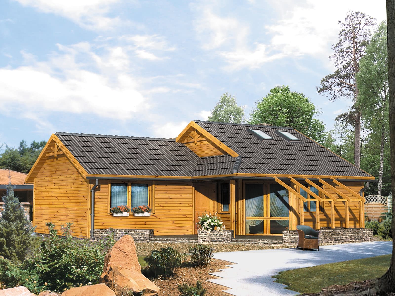 Ściany: bal drewniany + wełna mineralna, Stropy: na belkach drewnianych, Dach: dachówka bitumiczna, kąt nachylenia 26°Rzuty