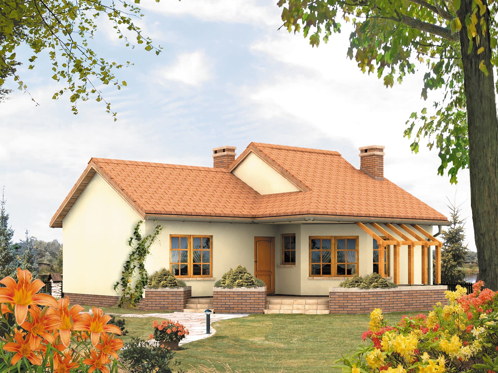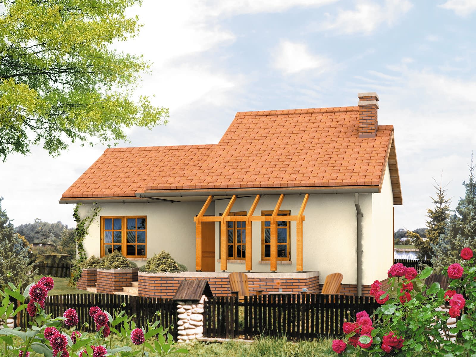 Mały dom jednorodzinny, parterowy, niepodpiwniczony. Częściowo zadaszony taras. Możliwość rozbudowy domu o garaż.Konstrukcja