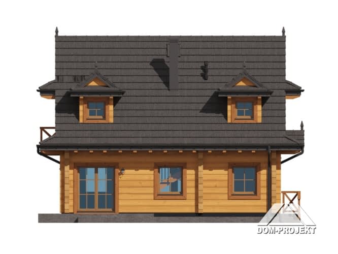 Projekt przytulnego, wygodnego domu z bali, inspirowany stylem zakopiańskim. Na parterze bardzo dobrze doświetlona strefa dzienna - salon z kominkiem i kuchnia z jadalnią. Program użytkowy uzupełnia łazienka i wiatrołap. Na poddaszu trzy wygodne, przestronne sypialnie oraz wspólna łazienka. Dwa pokoje mają dostęp do balkonu.Rzuty