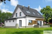 Energooszczędny dom z użytkowym poddaszem, doskonała propozycja dla inwestorów szukających domu wygodnego o bardziej tradycyjnym wyglądzie, podkreślonym głownie przez kamienną podmurówkę, wykusz oraz drewnianą pergolę. Do wnętrza zaprasza ciekawie zaaranżowane wejście, gdzie ze wiatrołapu można przejść do garażu. Centralną część domu stanowi przestronny pokój dzienny z wykuszem i kominkiem. Graniczy z nim wygodna kuchnia, obok której zaplanowano podręczną spiżarnię. Jest tu także dodatkowy pokój, mogący służyć jako gabinet lub gościnny oraz ogólnodostępna łazienka. Na poddaszu wyodrębniono wyraźną strefę prywatną, gdzie znajduje się duża łazienka oraz trzy sypialnie – z dwóch z nich można wyjść na balkon.