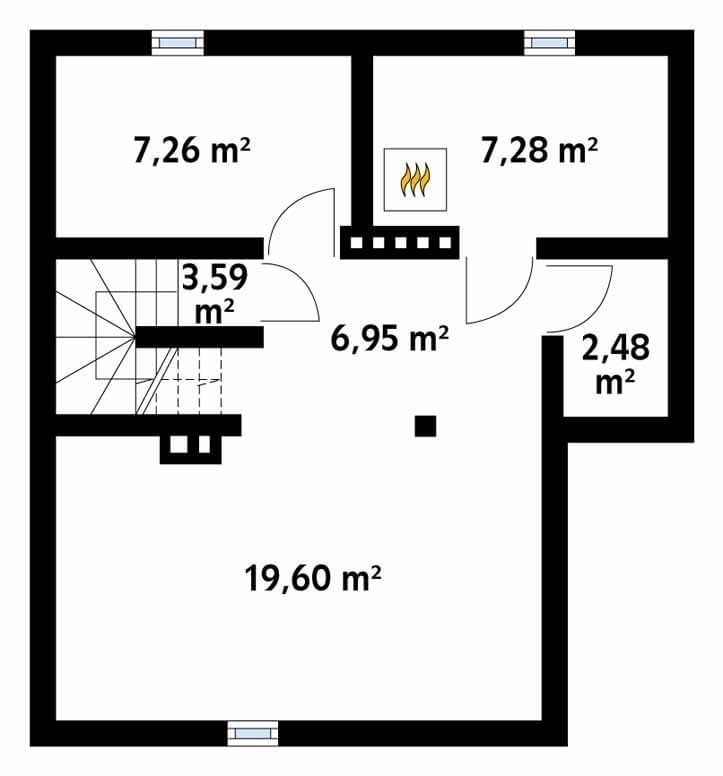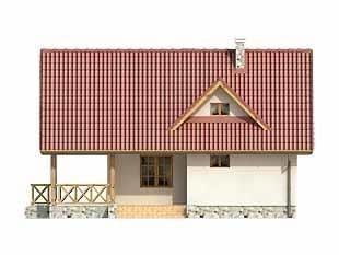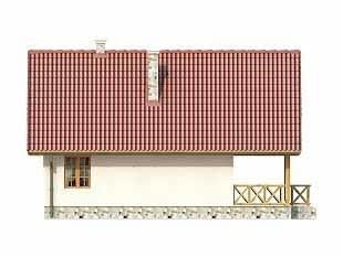 Mały dom jednorodzinny z użytkowym poddaszem i podpiwniczeniem. Prosty, funkcjonalny układ. Duży zadaszony taras. Istnieje wersja domu letniskowego.Konstrukcja