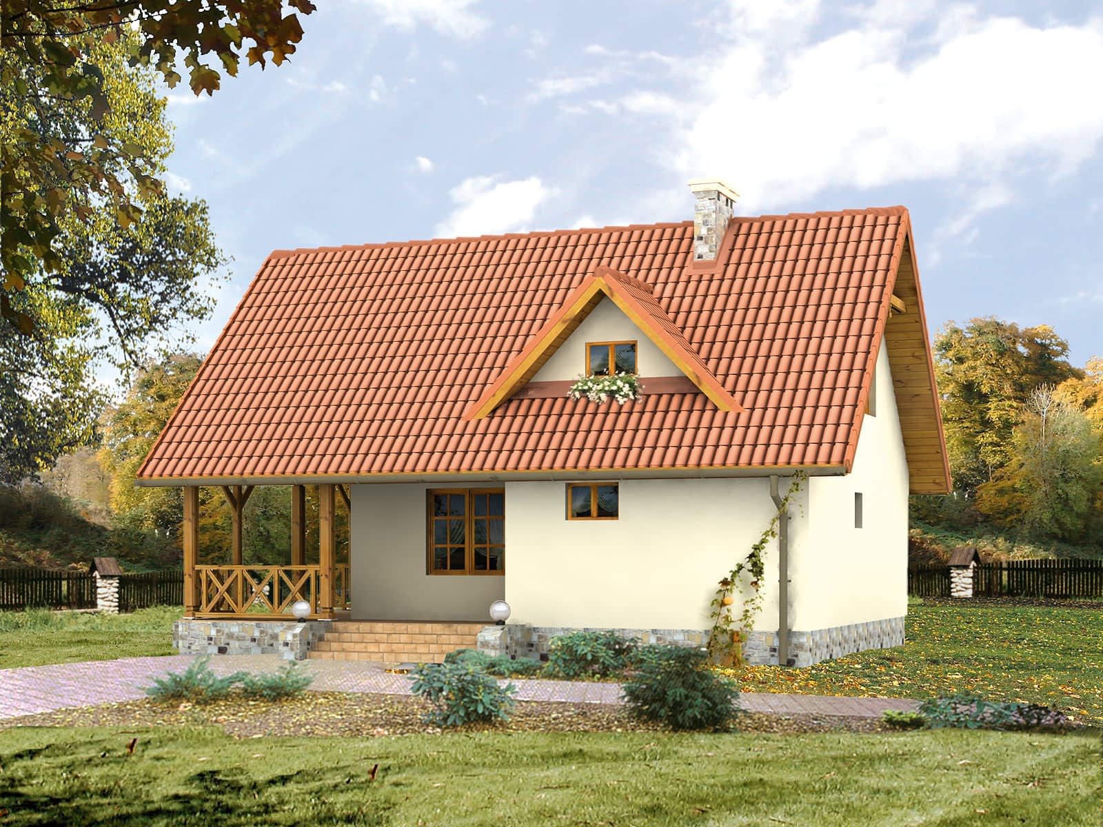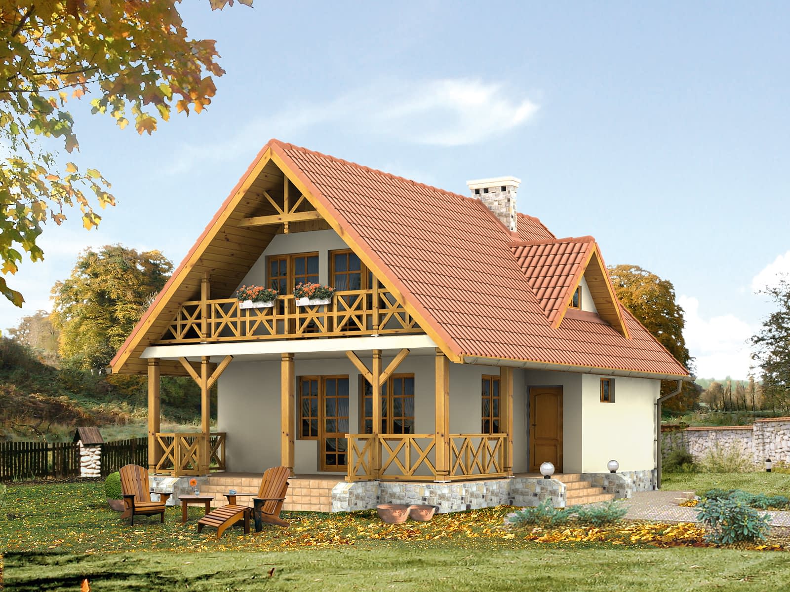 Mały dom jednorodzinny z użytkowym poddaszem i podpiwniczeniem. Prosty, funkcjonalny układ. Duży zadaszony taras. Istnieje wersja domu letniskowego.Konstrukcja